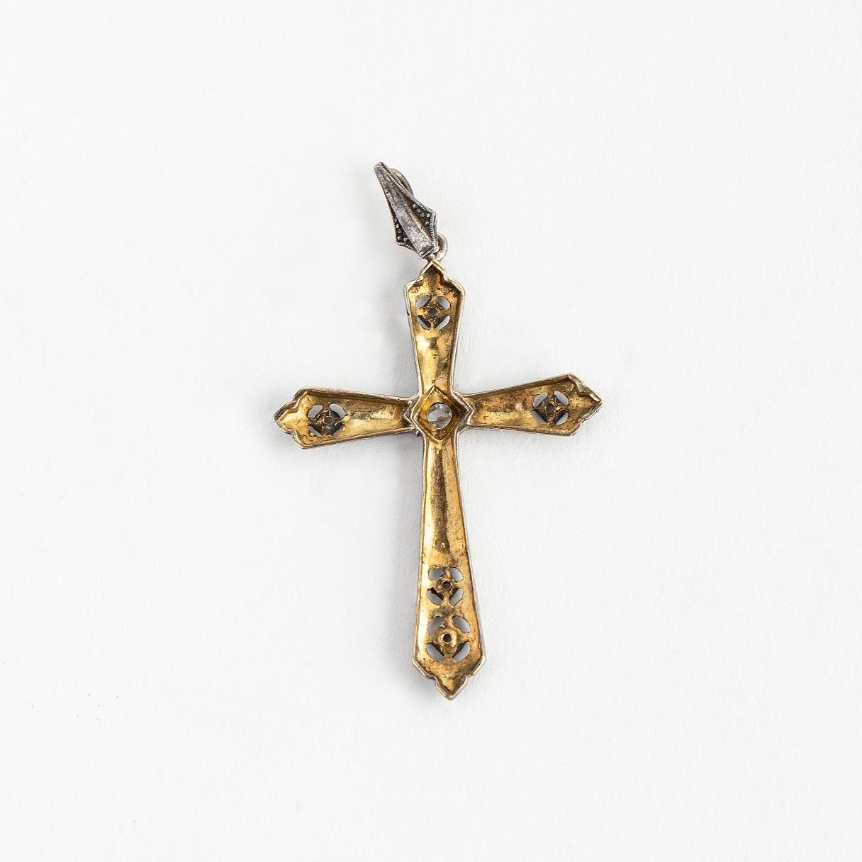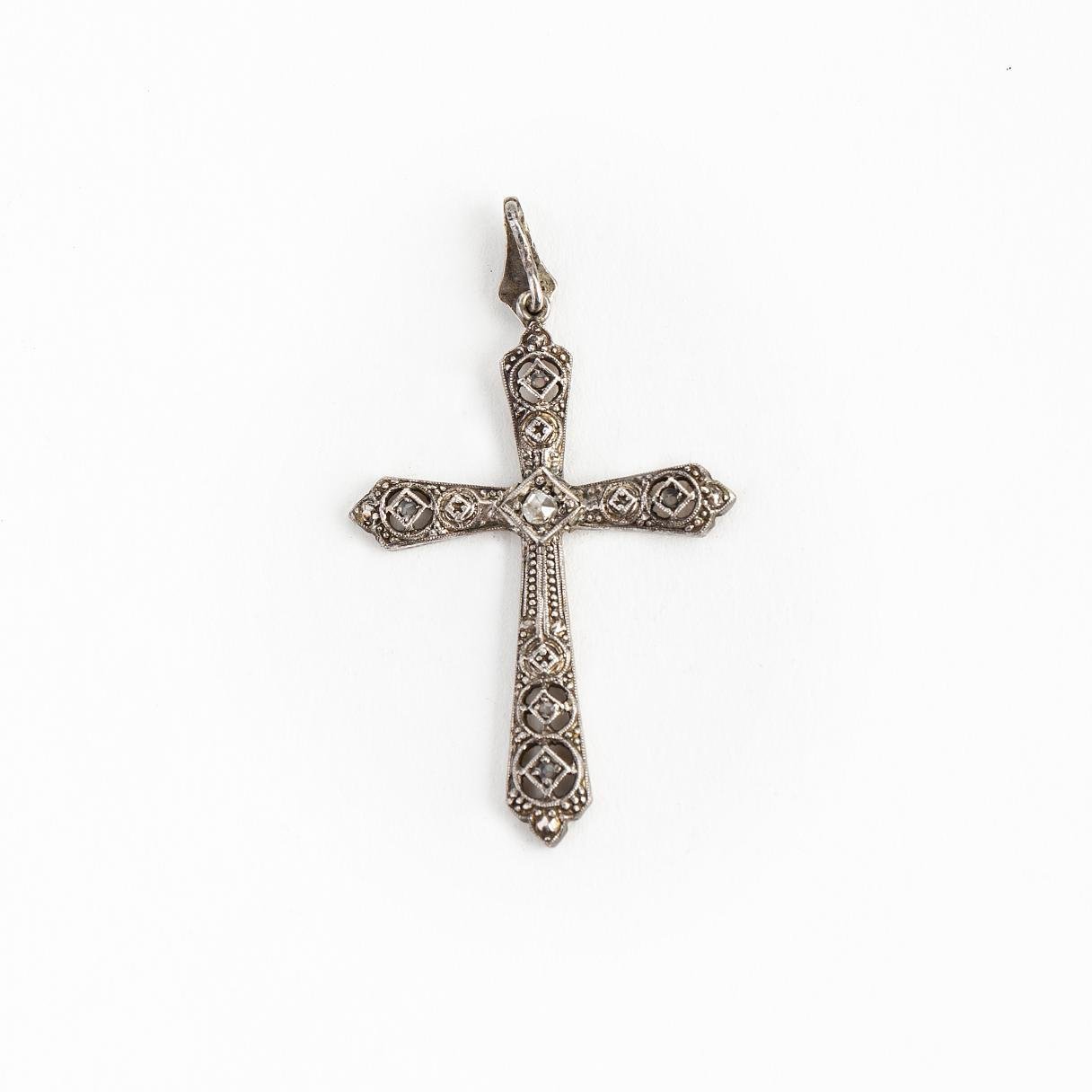 Crucifijo art decó en oro blanco y amarillo decorado con seis diamantes. 45 x 26 mm. Peso bruto 2 gr.