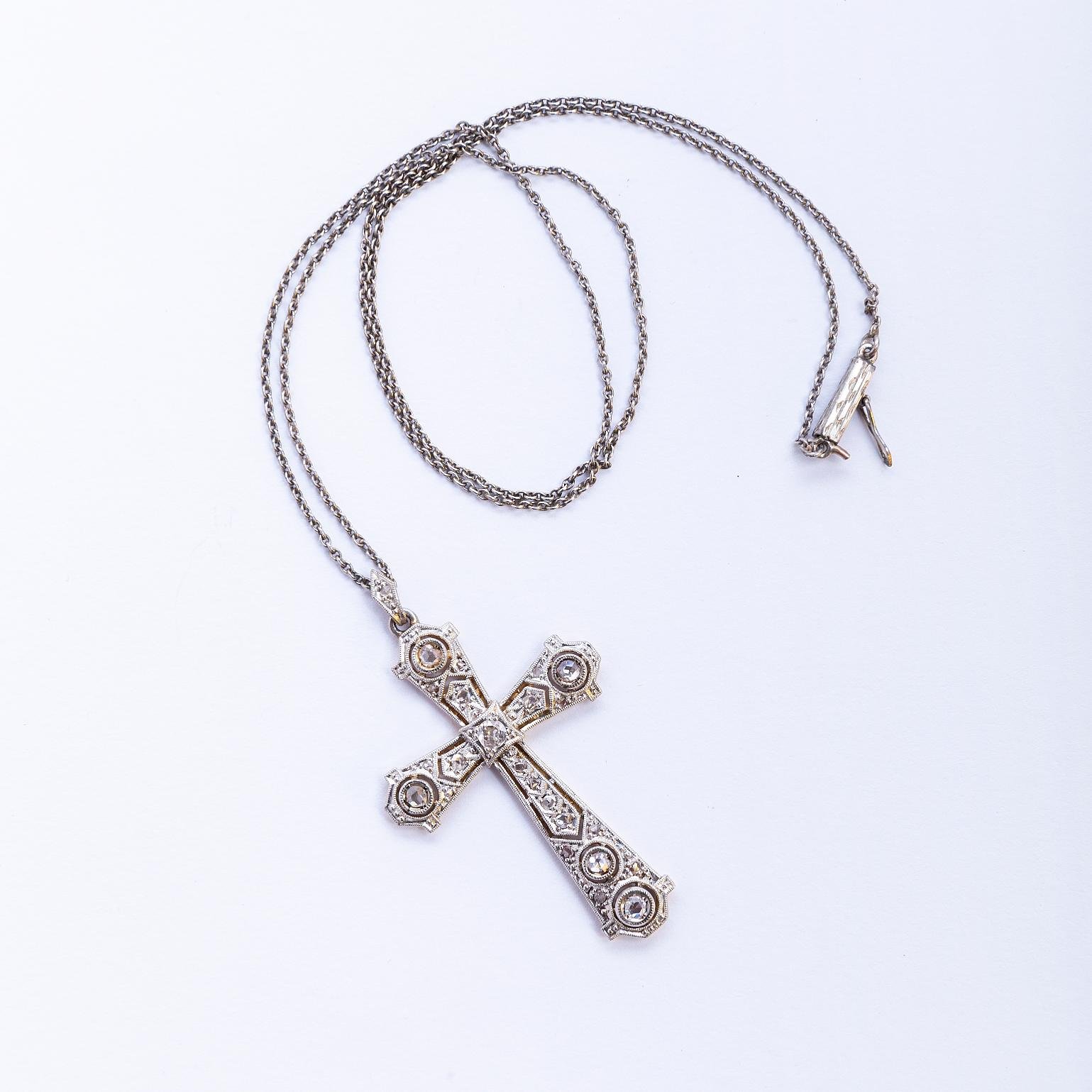 Cruz art decó en oro 18 K blanco y amarillo con seis pequeños brillantes y varios diamantes. 38 x 25 mm. Con cadena en plata.
