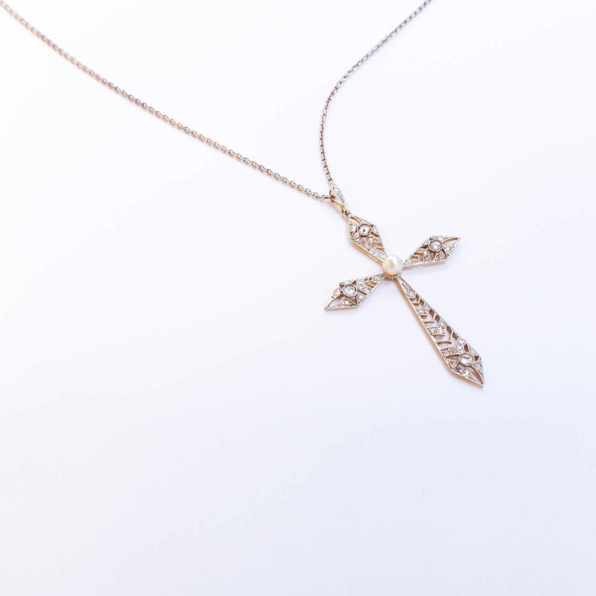 Cruz art decó en oro 18 K blanco y amarillo calado, con perla central de cultivo de un diámetro de 5 mm, cuatro brillantes y varios diamantes. 58 x 37 mm. Con cadena en plata.