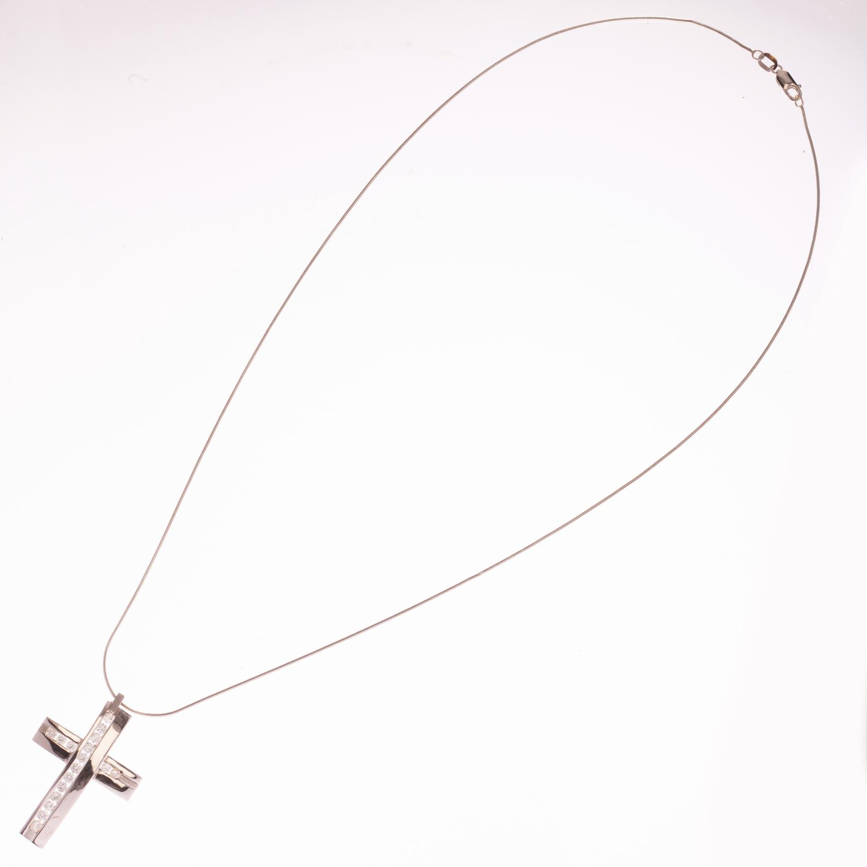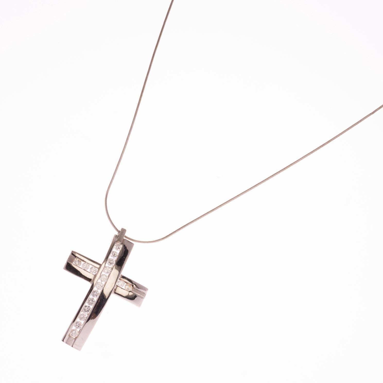 Cruz en oro 18 K blanco con diecisiete diamantes talla brillante. 37 x 24,5 mm. Con cadenilla flexible en oro 18 K blanco. Peso total bruto 8,6 gr.