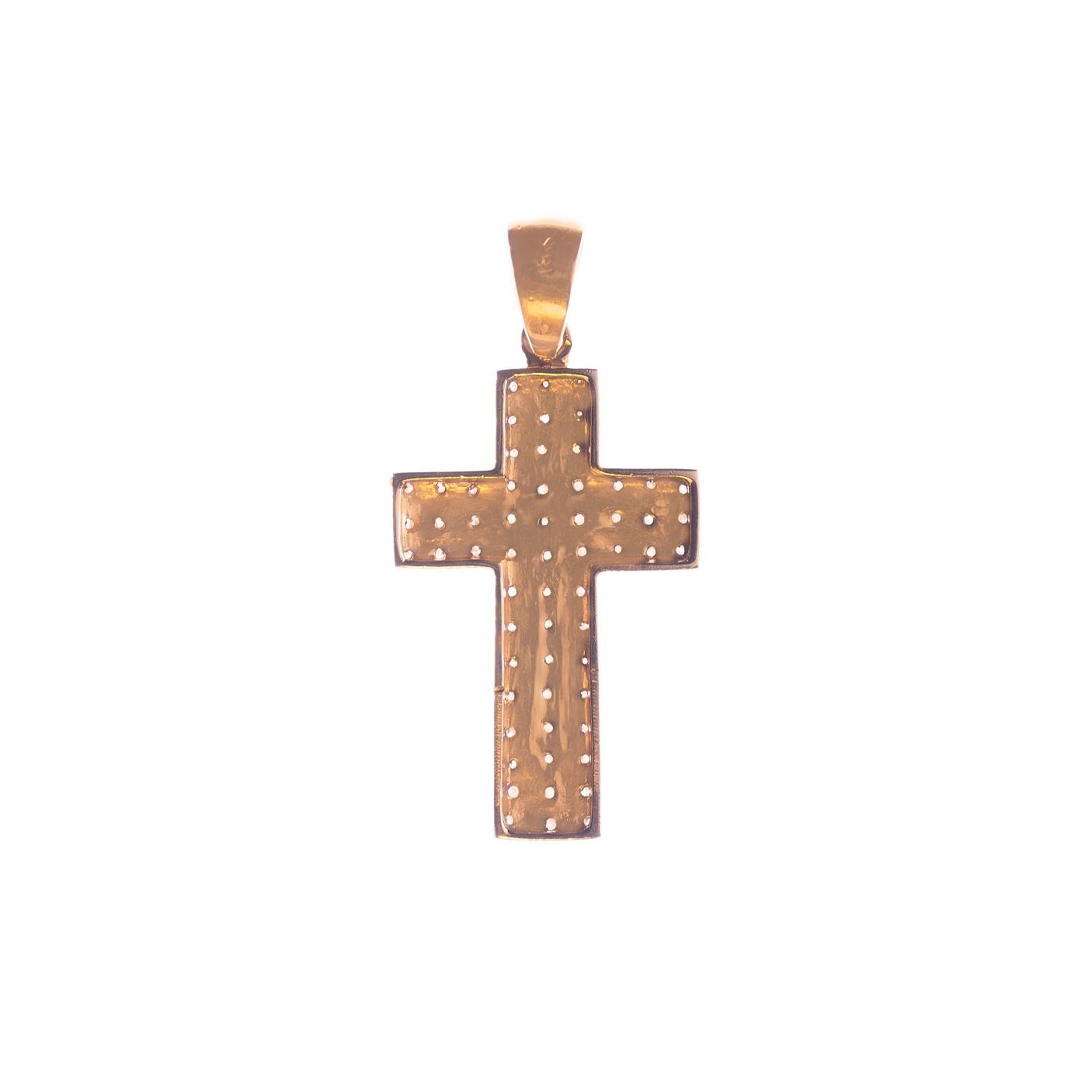 Cruz en oro 18 K amarillo totalmente decorada con sesenta pequeños diamantes talla brillante. 28 x 17 mm. Peso bruto 3,9 gr.