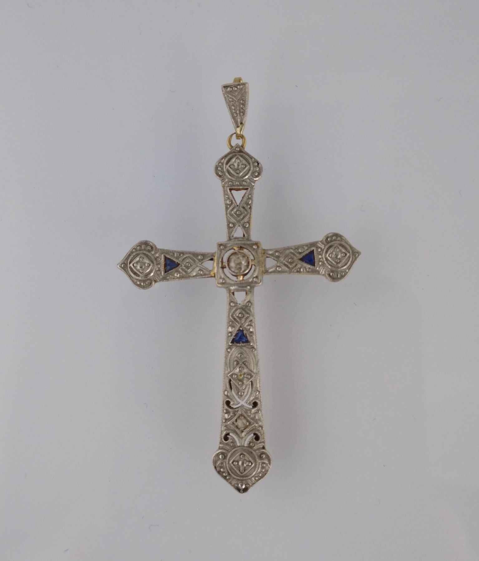 Cruz art decó en oro 18 K blanco y amarillo calado y cincelado, con pequeño brillante central, un diamante y tres pequeños zafiros (espacio original para ocho). 53 x 31 mm.