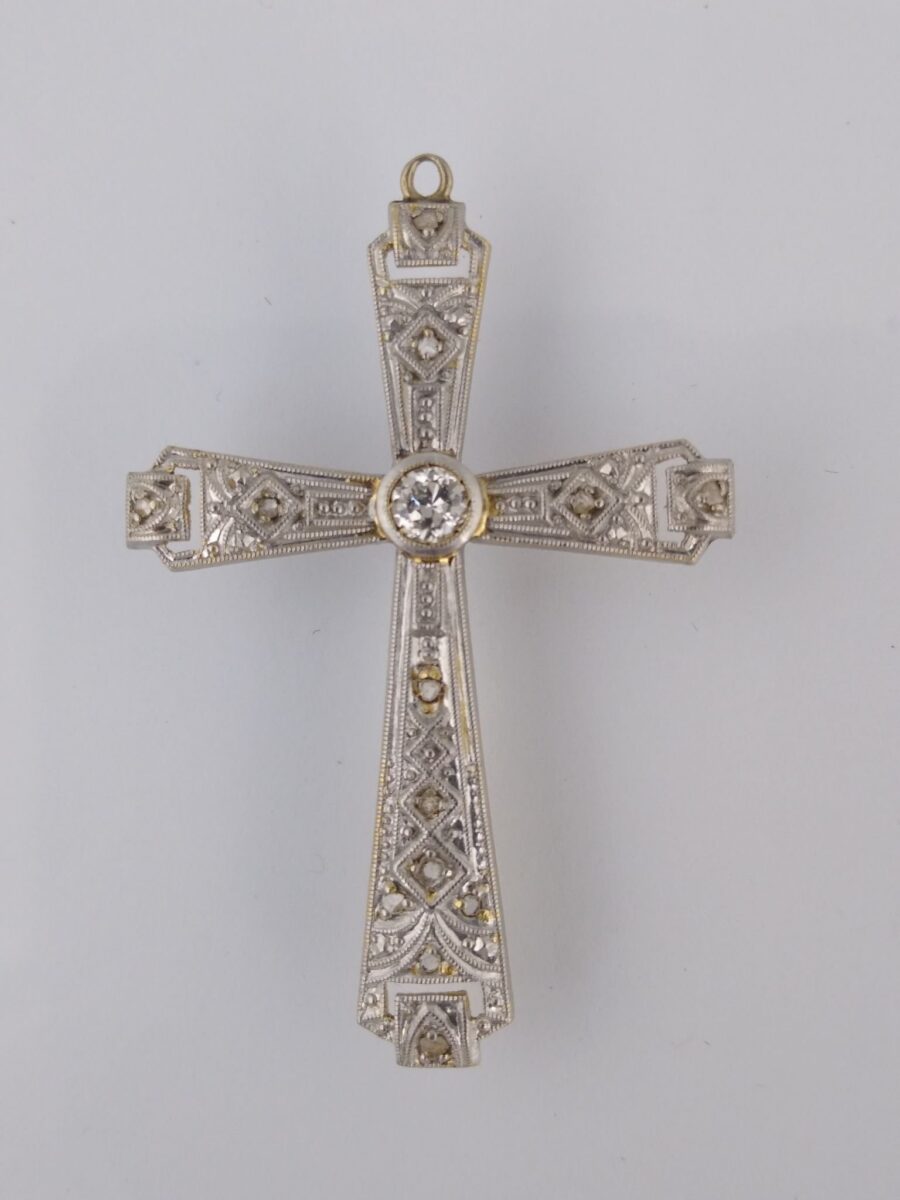 Cruz art decó en 18 K blanco y amarillo con pequeño brillante central y diez diamantes. 39 x 26 mm. Peso bruto 2.6 gr.
