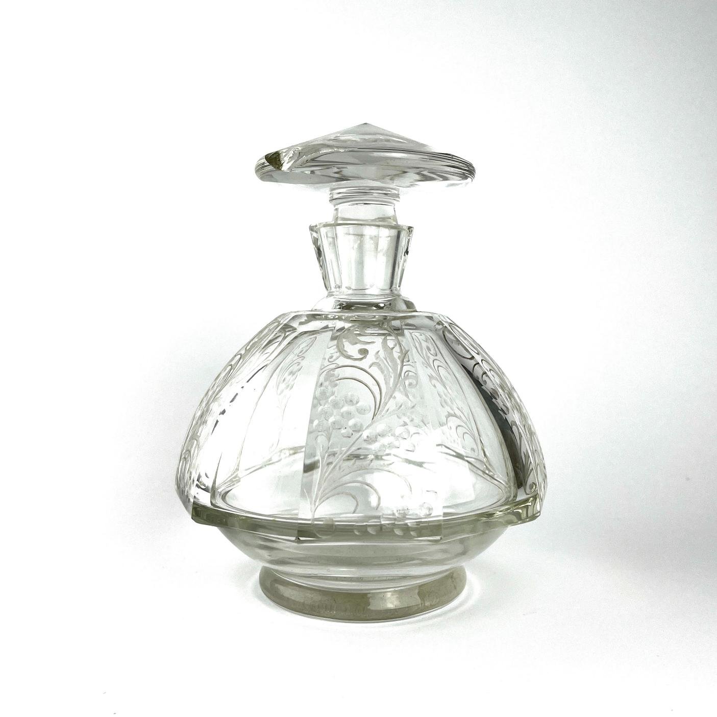 Botellón en cristal facetado y tallado «hojas», con tapón. Cascaduras en tapón. Alto 17 cm.