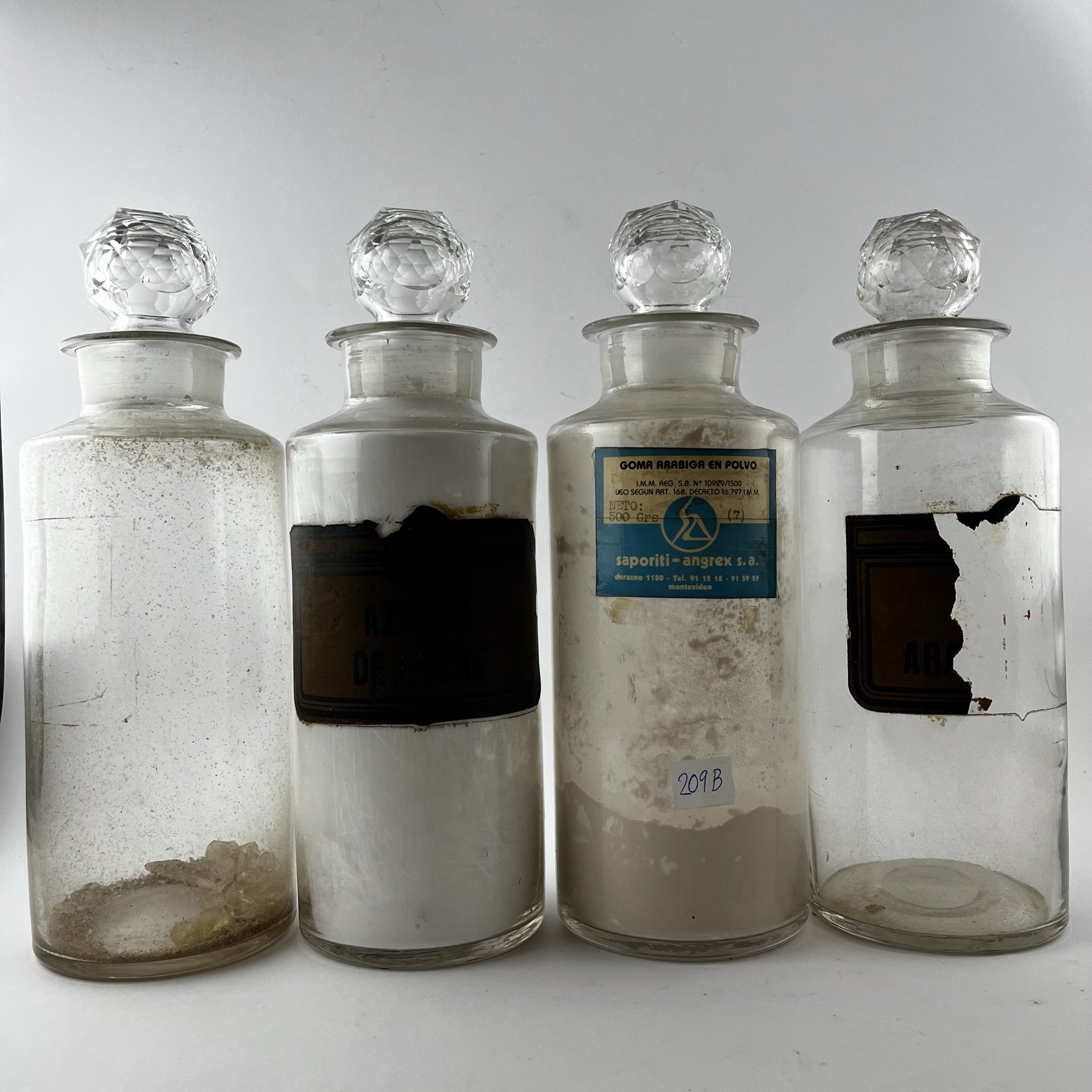 Cuatro frascos de farmacia en vidrio soplado con tapones en vidrio tallado. Altos 29 cm.