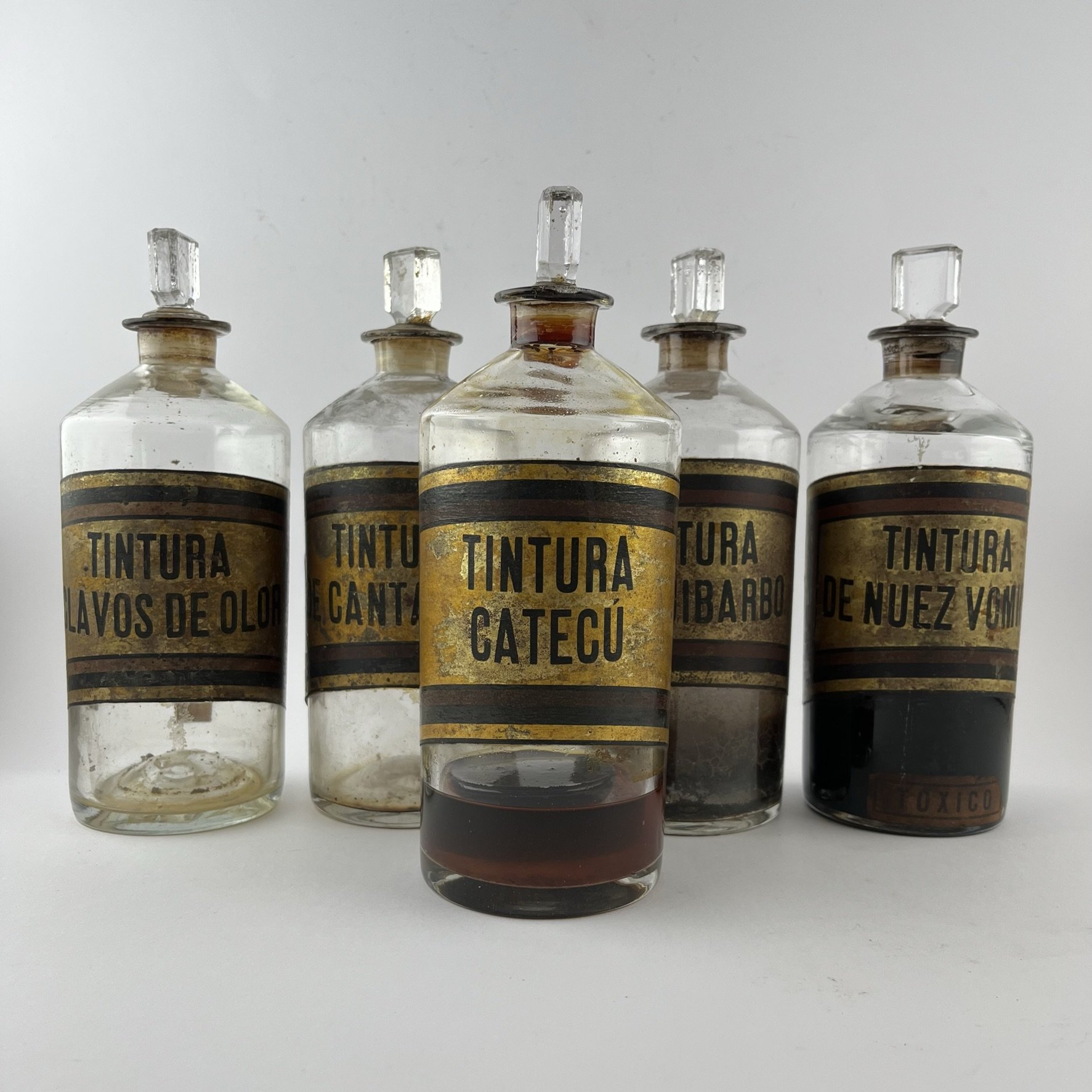 Cuatro frascos de farmacia en vidrio soplado con tapones en vidrio facetado y etiquetas en papel, tres de ellas pintadas a mano y doradas y una impresa, con inscripciones «Perclor: Hierr: Puro», «Tintura de Genciana», «Tintura de Cubeba» y «Alcoholato de Coclearia». Altos 23 cm.