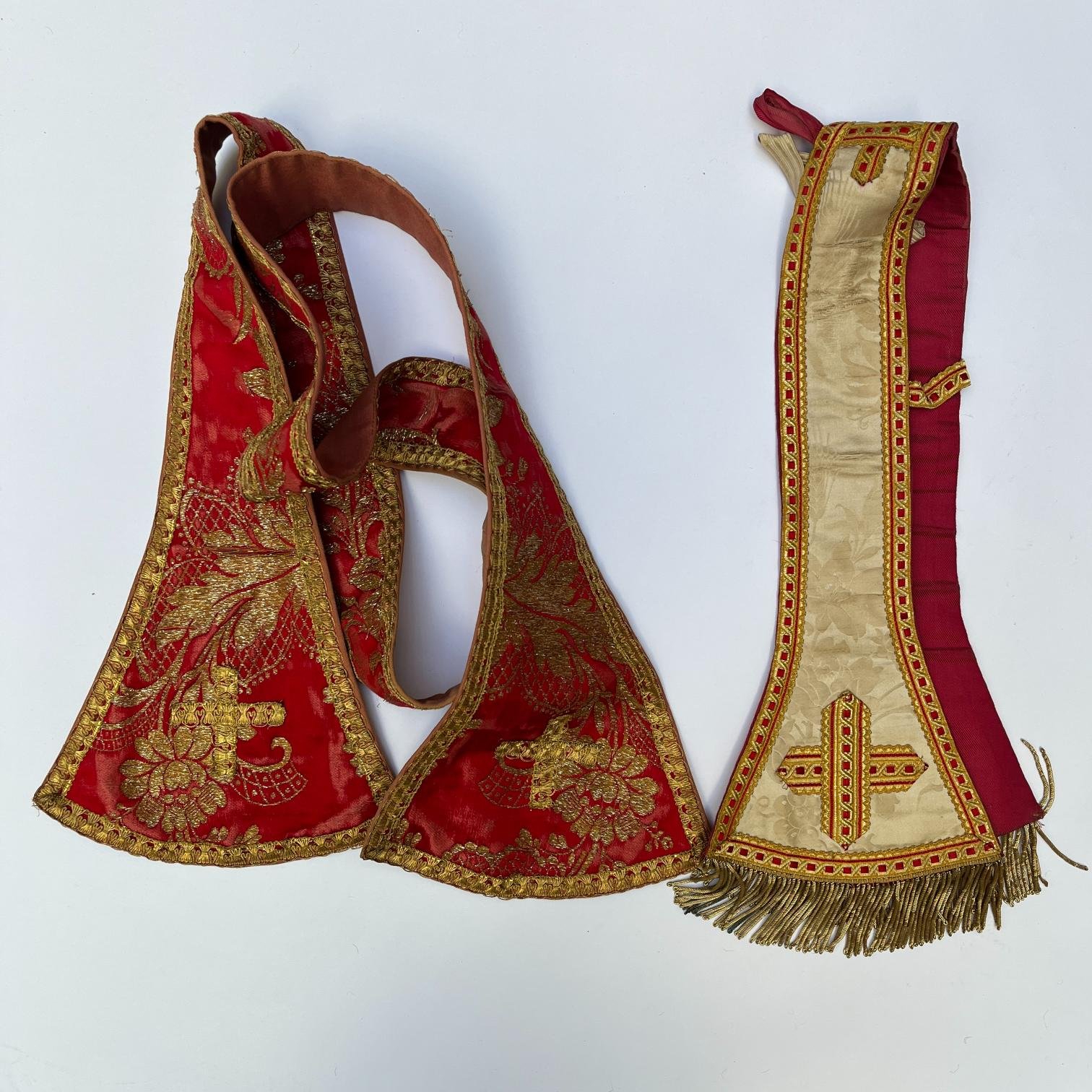 Cuatro piezas sacerdotales: dos estolas, una casulla y una capa.