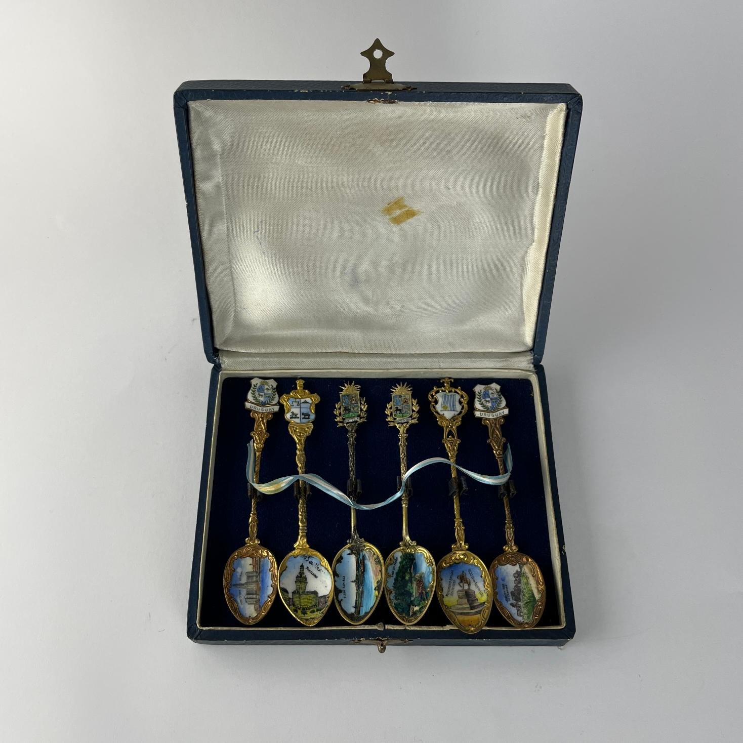 Conjunto de seis cucharas para té en plata vermeil y esmalte decoradas «vistas de Montevideo» y «escudos de armas uruguayos».