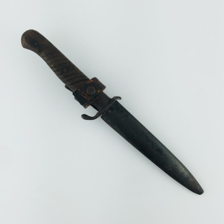 Cuchillo alemán de trinchera época WWI. Hoja con marca de fabricante no identificado. Cabo en madera tallada. Gavilán en hierro forjado. Vaina original en hierro y cuero.