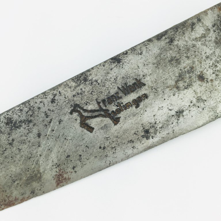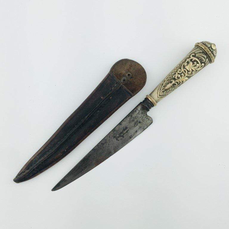 Cuchillo criollo. Hoja «Franz Wenk», Solingen. Cabo en plata y oro cincelados «hojas y flores». Largo total 26 cm. Vaina en cuero marrón.
