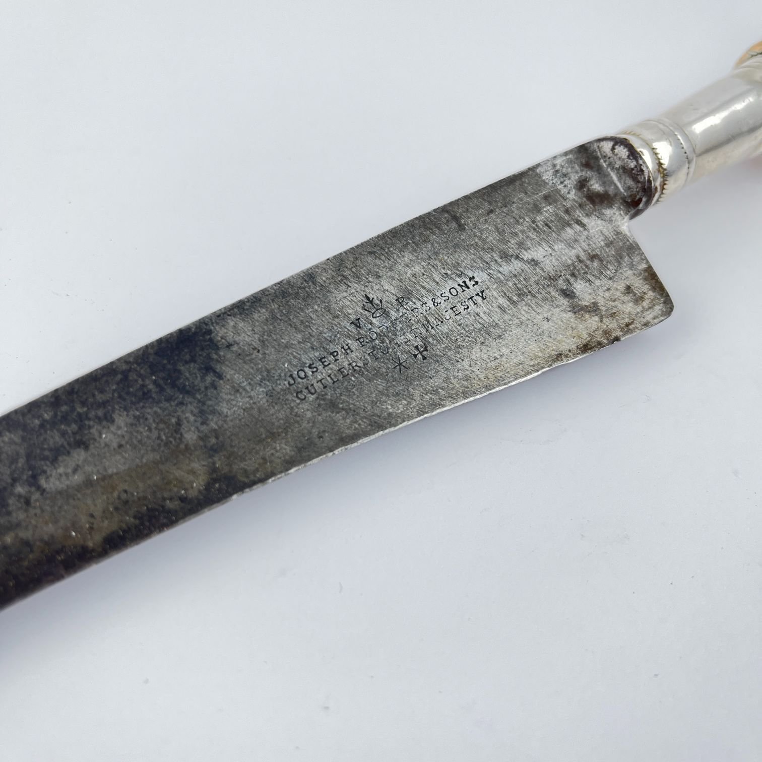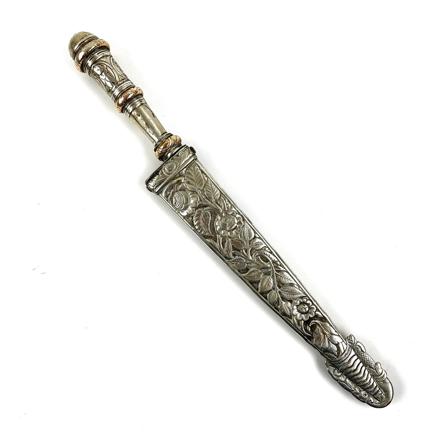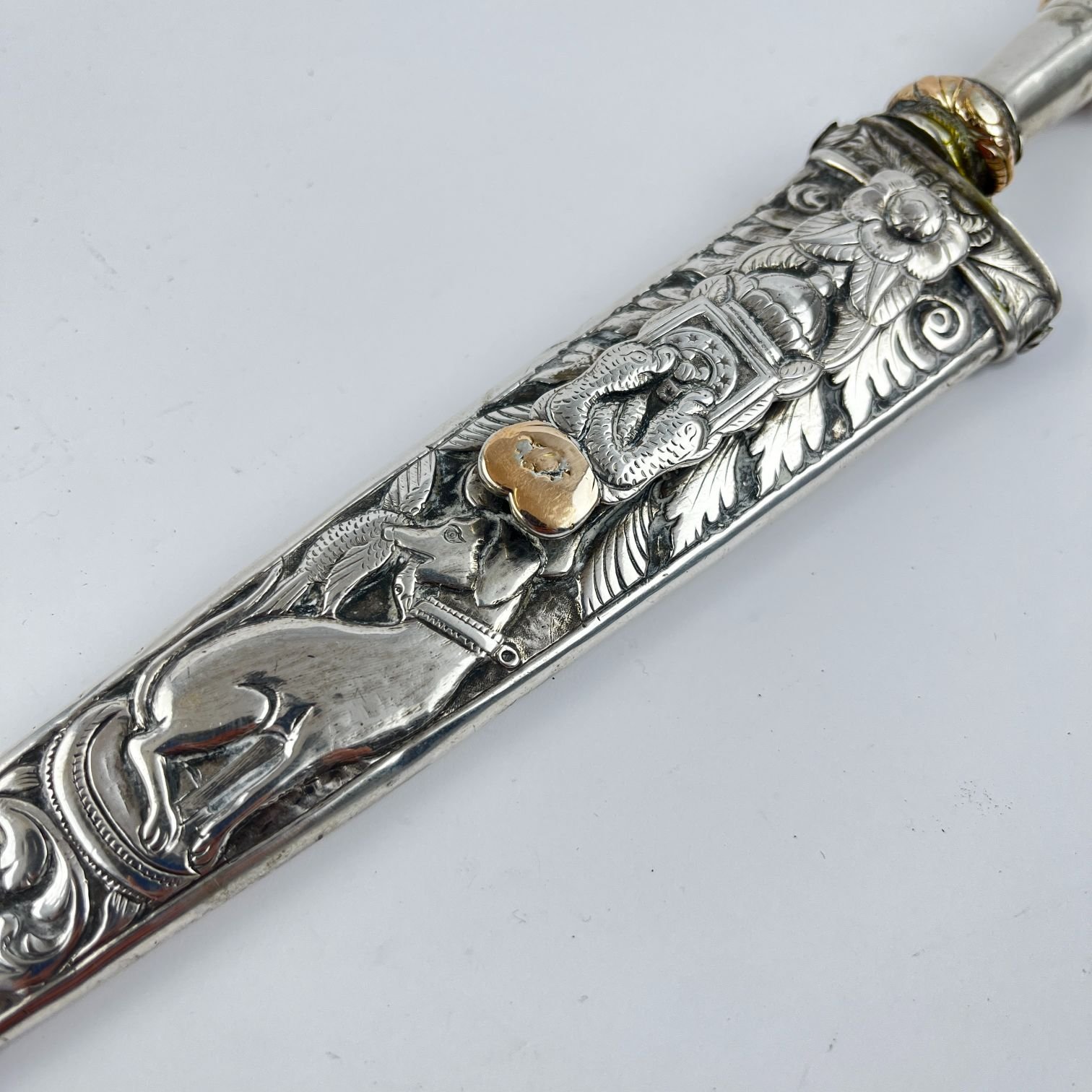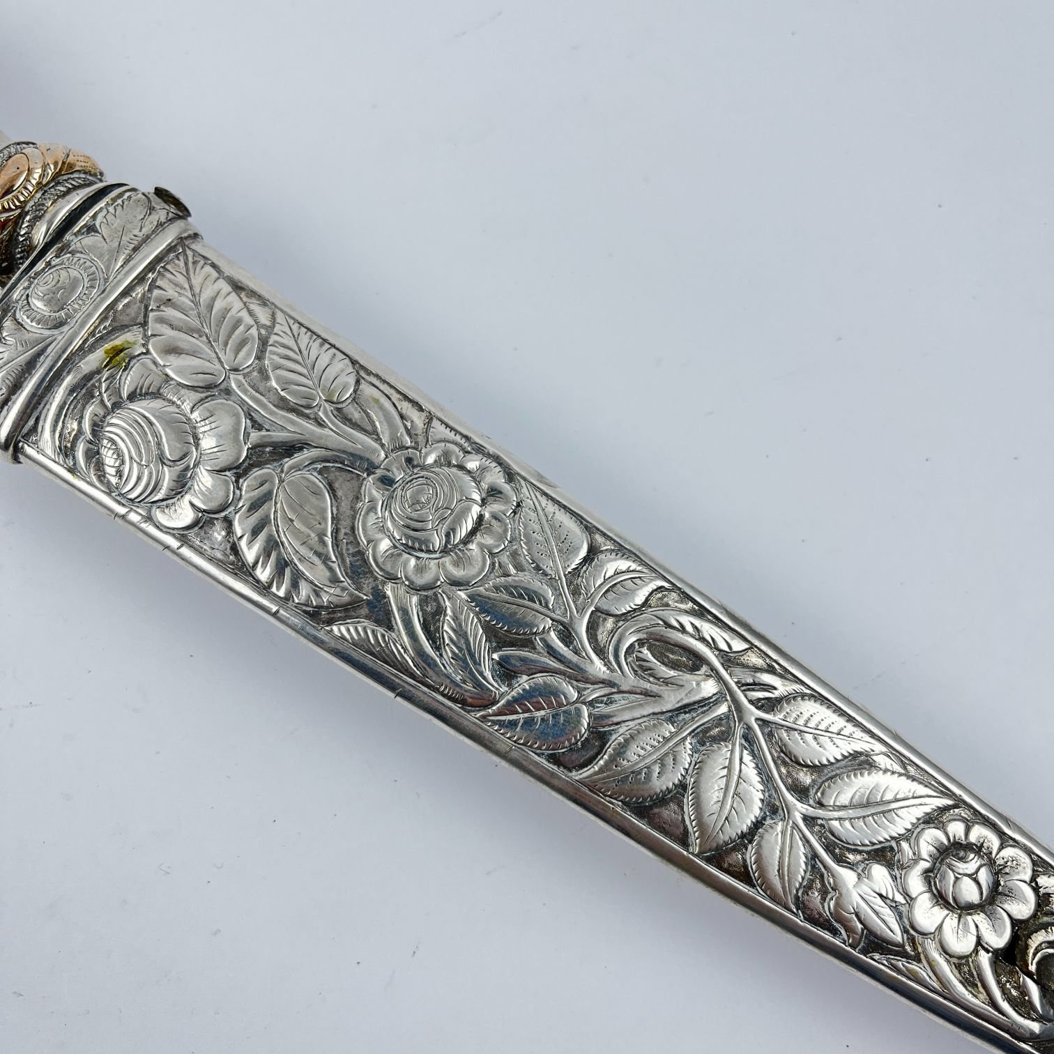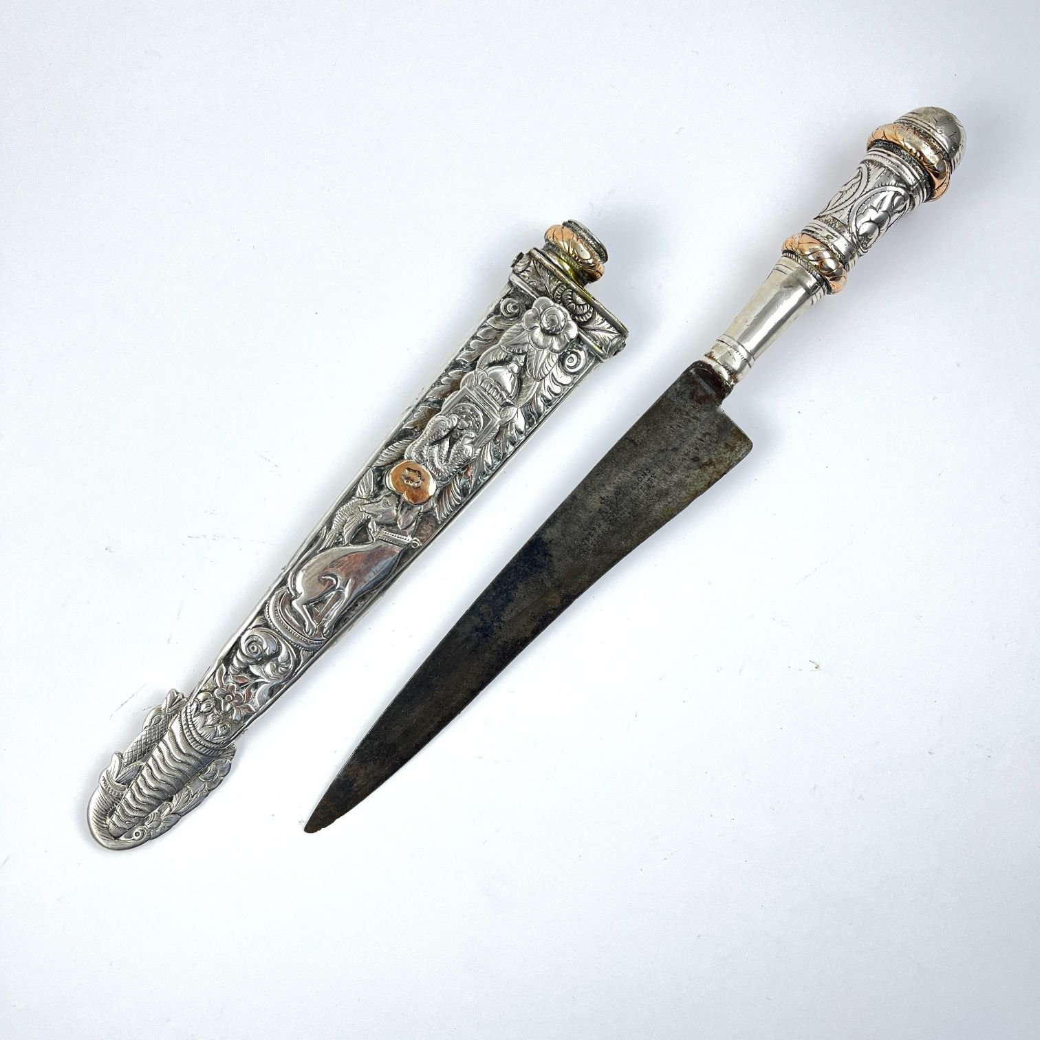 Cuchillo criollo riograndense. Hoja Joseph Rodgers & Sons, época Reina Victoria. Cabo y vaina en plata y oro. Vaina totalmente cincelada «hojas, flores y perro de cacería», con gancho esculturado «blasón imperial brasileño» y «delfines». Bocavaina decorada con anilla en oro. Cabo cincelado «hojas y flores» con dos anillas en oro cincelado. Largo total 34 cm.