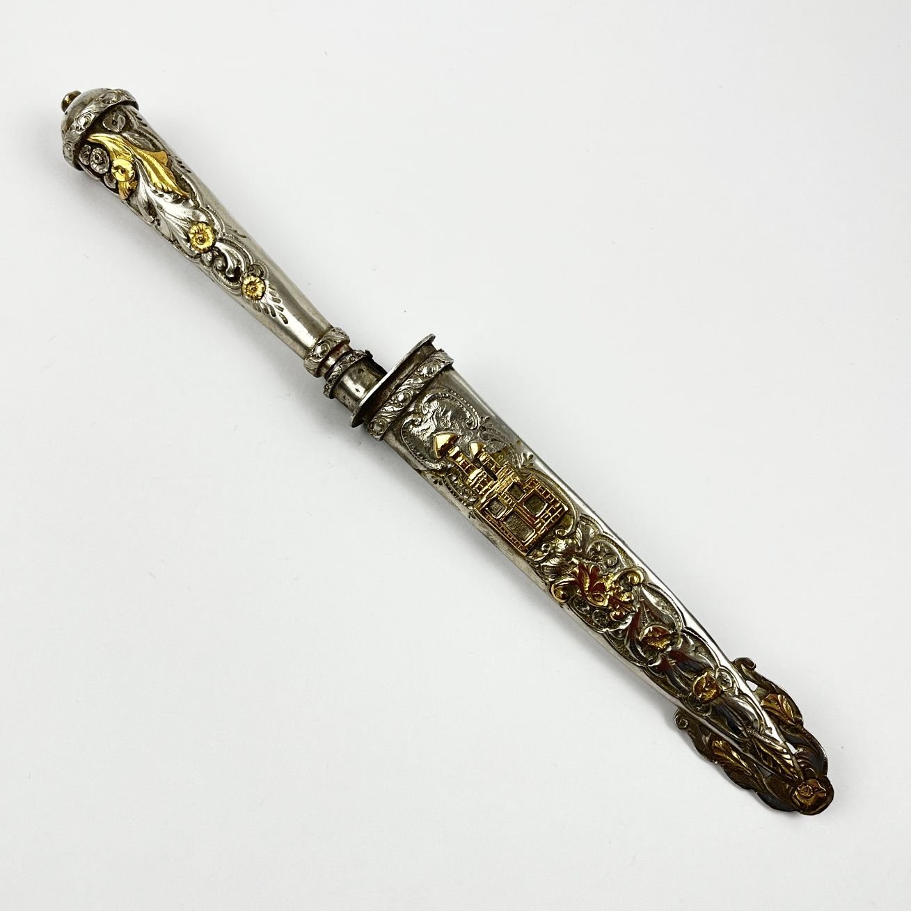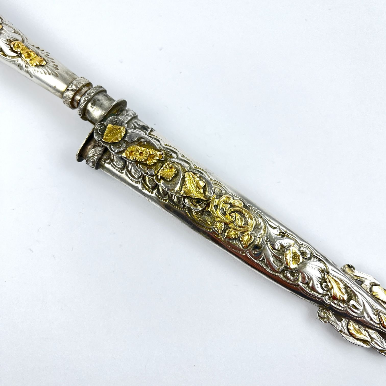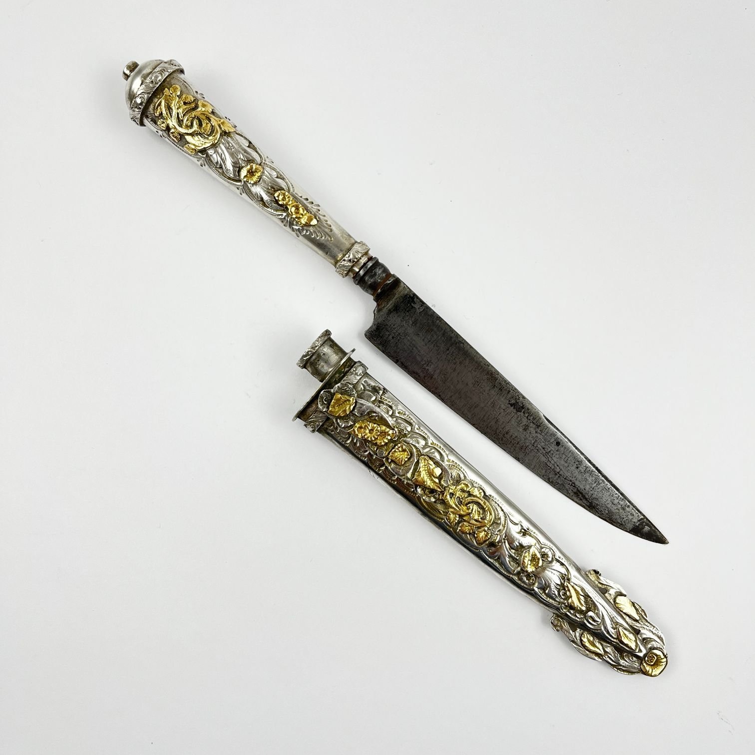 Cuchillo criollo. Cabo y vaina en plata y oro cincelados «hojas, flores y casa». Largo total 22 cm.