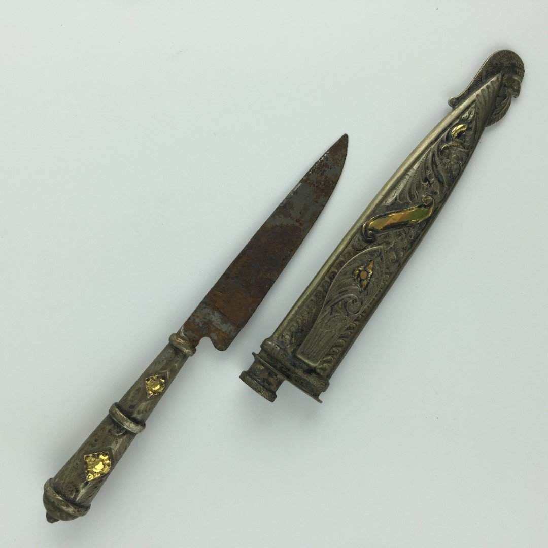 Cuchillo criollo. Hoja M.H. de Martínez Hnos. Cabo y vaina en plata y oro cincelados «hojas y flores». Largo total 24 cm.