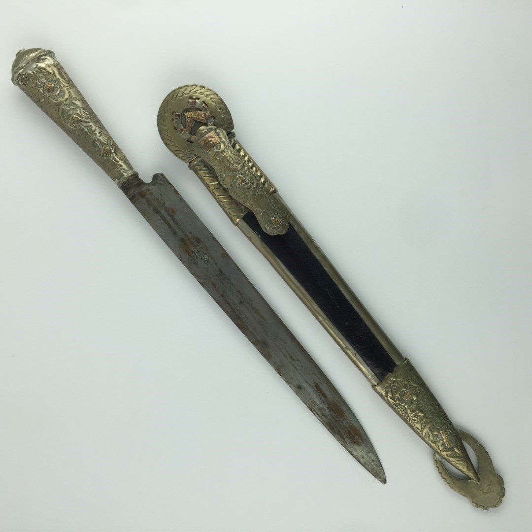 Cuchillo criollo. Hoja Solingen. Cabo, bocavaina y puntera en plata y oro cincelados «hojas y flores». Vaina picasa en cuero negro con costillas de plata lisa. Largo total 51 cm.