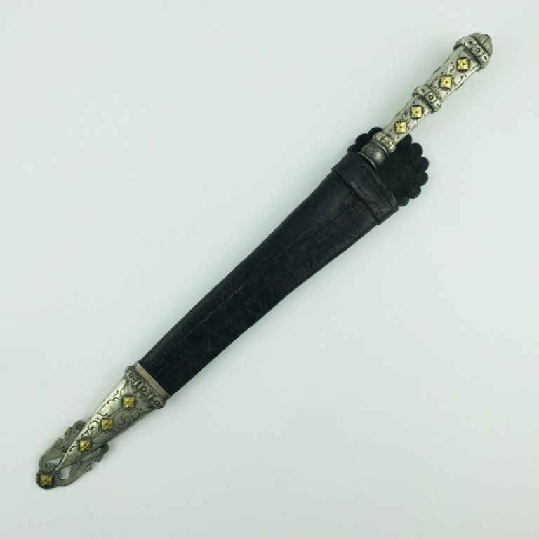 Cuchillo criollo. Hoja «Cinco Estrellas». Cabo cuadro y puntera en plata y oro cincelados «hojas y flores». Vaina picasa en cuero marrón repujado. Largo total 49 cm.