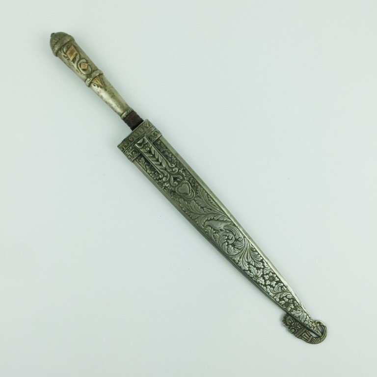 Cuchillo criollo. Hoja «Franz Wenk», Solingen. Cabo en plata y oro cincelado. Vaina en metal blanco estampado «hojas, flores y ave». Largo total 41 cm.