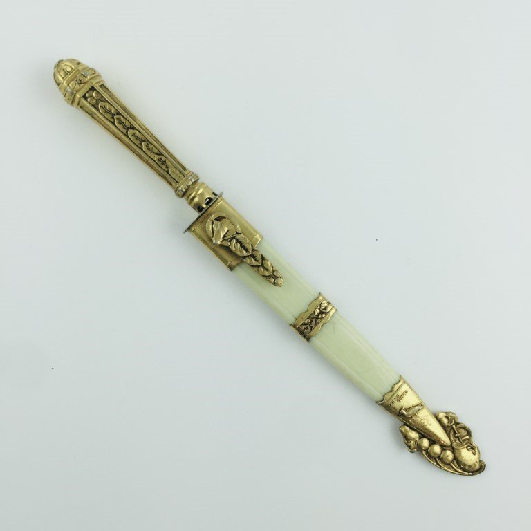 Cuchillo criollo riograndense «Quero Quero». Hoja «Corneta» en acero inoxidable. Cabo, bocavaina, pasador y puntera en metal dorado estampado «flores». Vaina picasa en celuloide blanco. Largo total 32 cm.