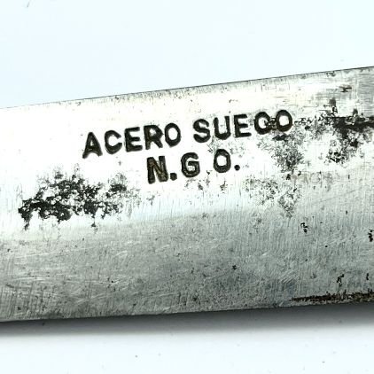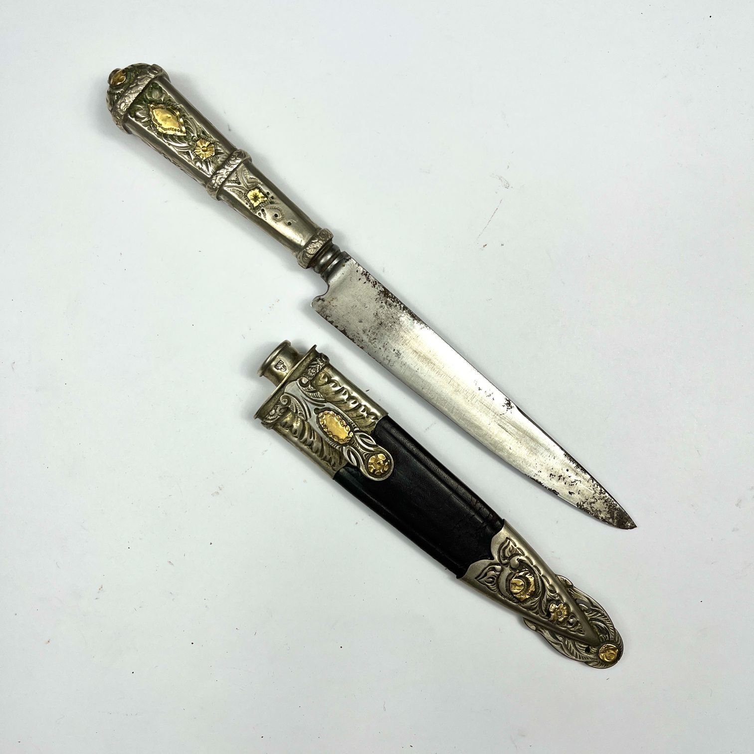 Cuchillo criollo. Hoja Acero Sueco «N.G.O.». Cabo cuadrado, puntera y bocavaina en plata y oro cincelados «hojas y flores». Vaina picasa en cuero negro. Con punzón de los plateros Martínez Hnos. Largo total 26 cm.