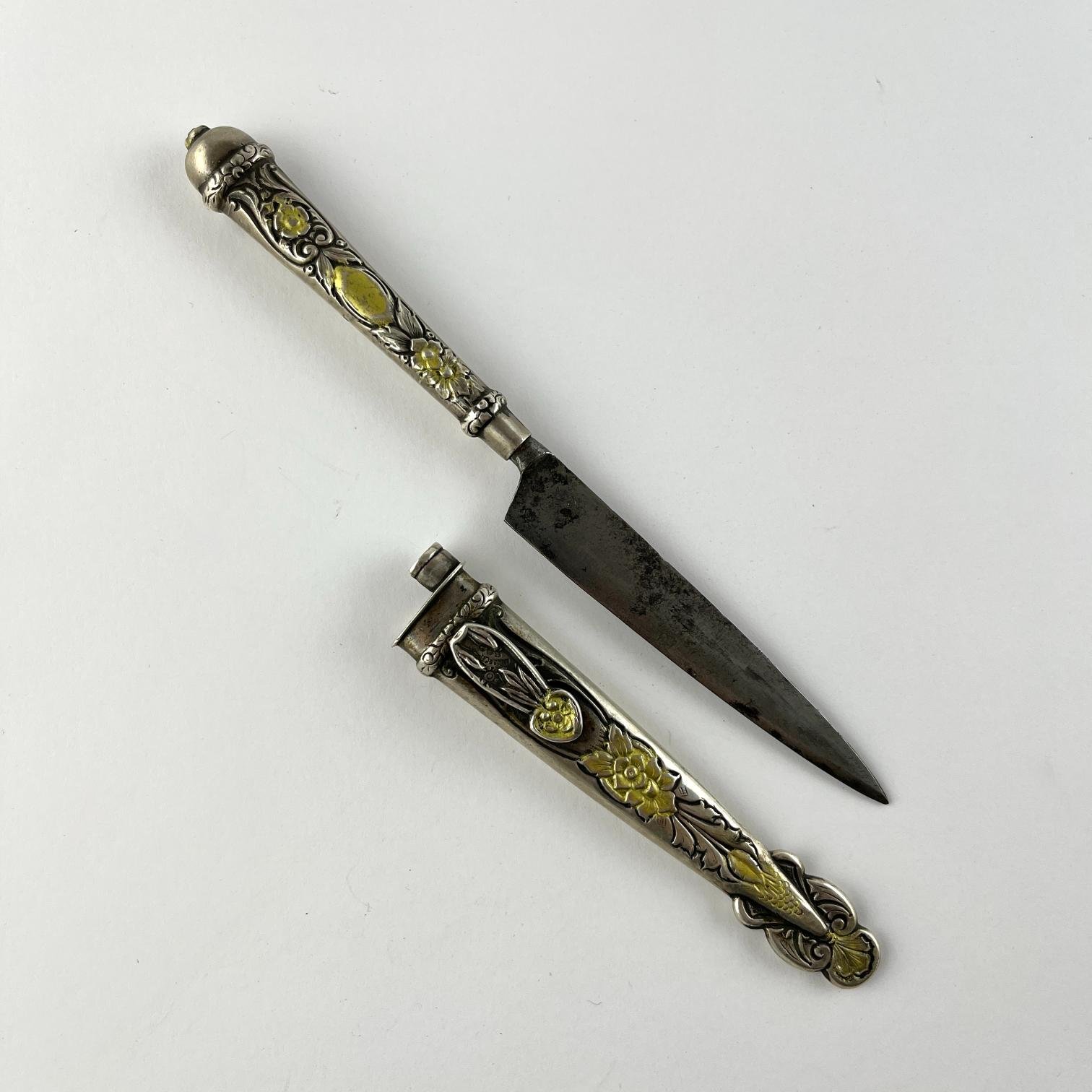 Cuchillo criollo. Hoja «Acero C.E.». Cabo y vaina en plata y oro cincelados «hojas y flores». Largo total 17,5 cm.