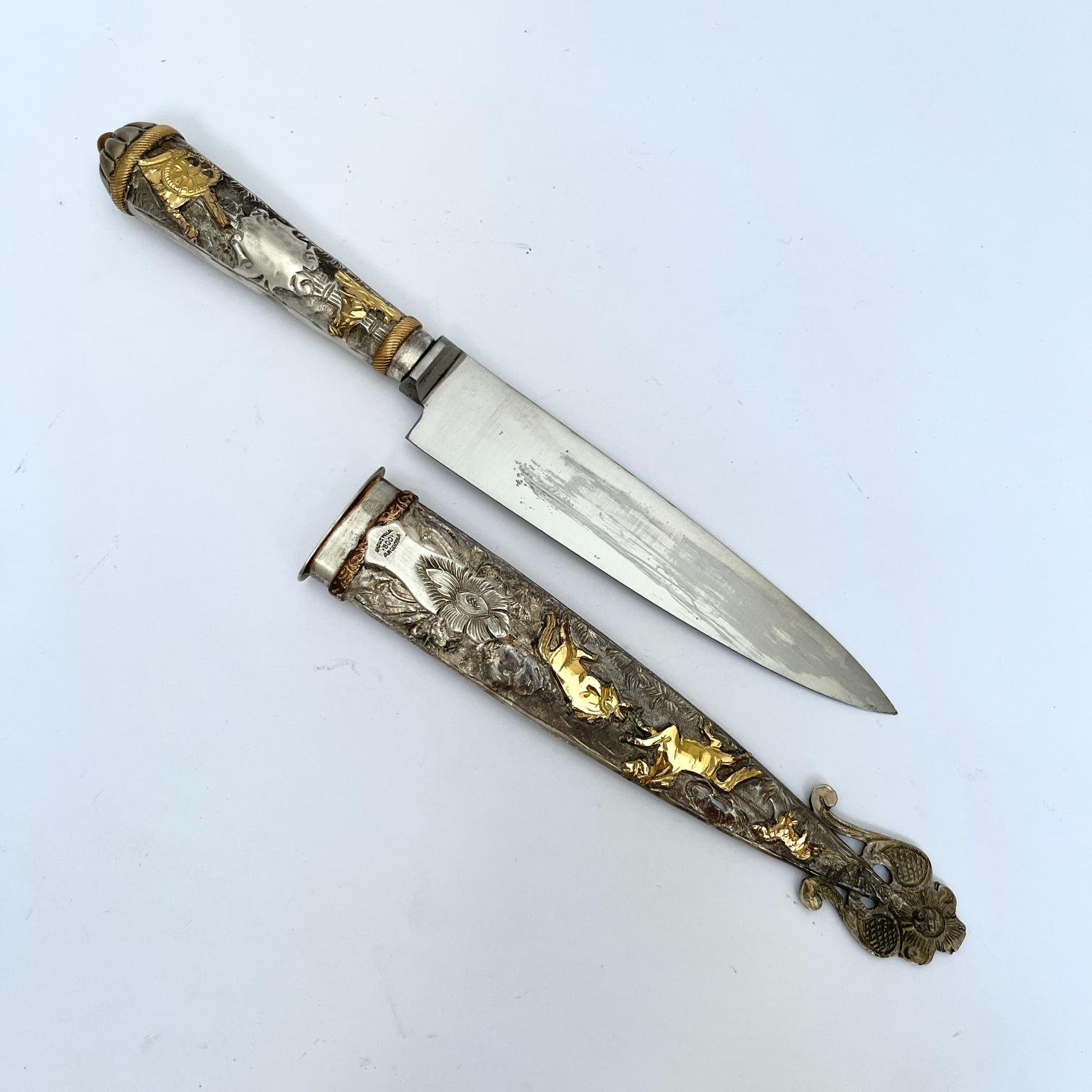 Cuchillo criollo argentino. Hoja «Arbolito» de Böcker. Cabo y vaina en plata y oro cincelados «escenas de campo». Largo total 30 cm.