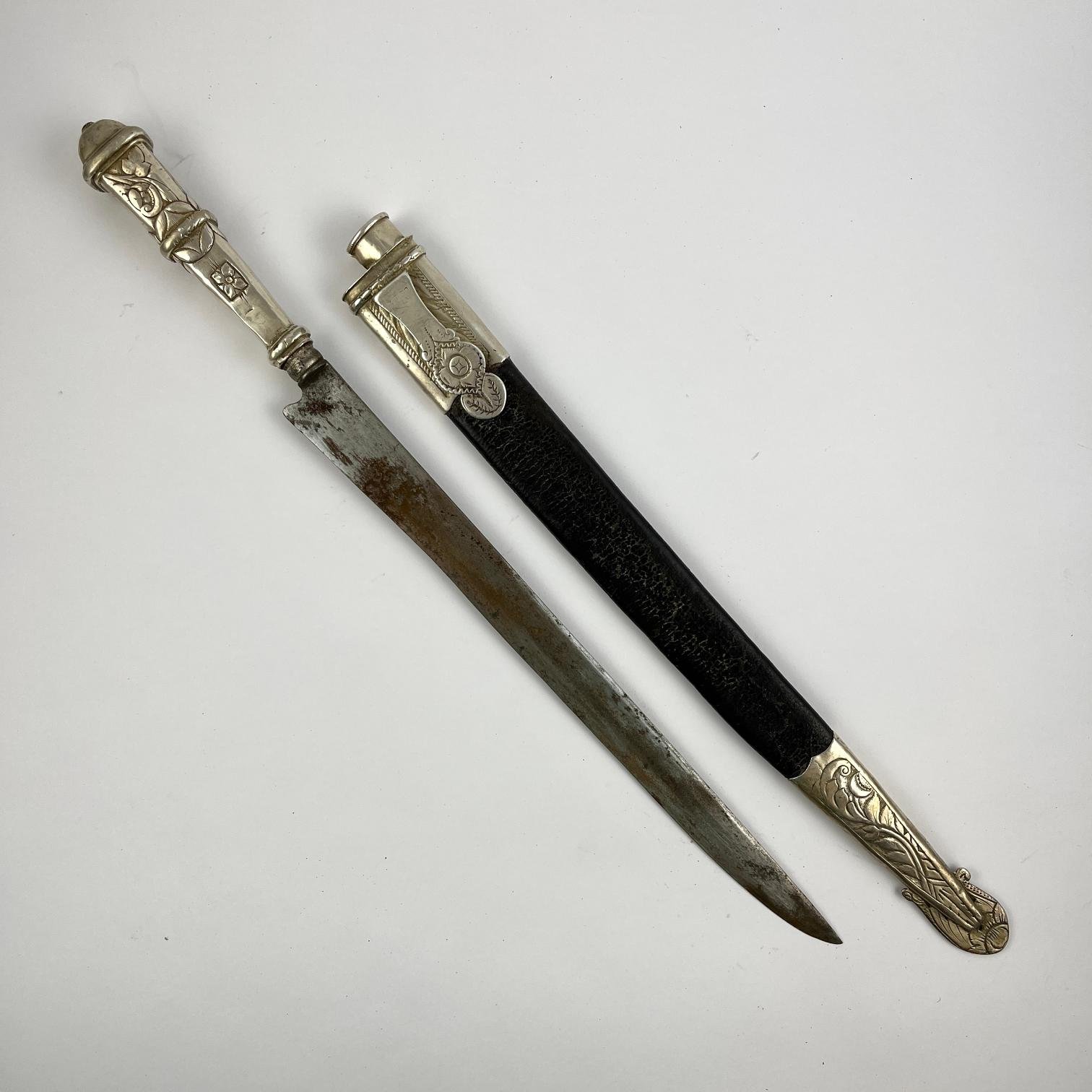 Cuchillo criollo. Hoja «Cazador al Filo» de J.M. Mailhos, Montevideo, acier fondu, con marca poco legible. Cabo, bocavaina y puntera en plata cincelada «hojas y flores», con punzón del platero C. Silva. Vaina picasa en cuero negro. Largo total 55 cm.