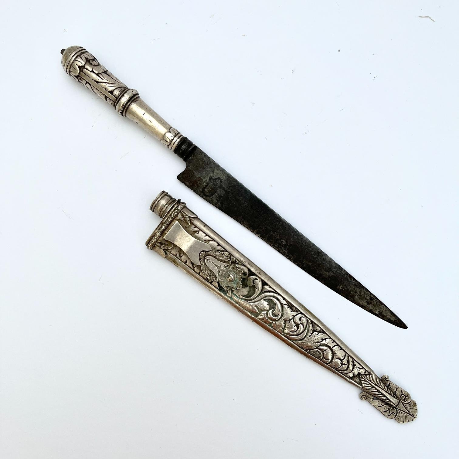 Cuchillo criollo. Hoja «Cazador al Filo» de J.M. Mailhos, Montevideo, con dirección 18 de Julio No. 15, acier fondu. Cabo y vaina en plata cincelada «hojas y flores». Largo total 35 cm.