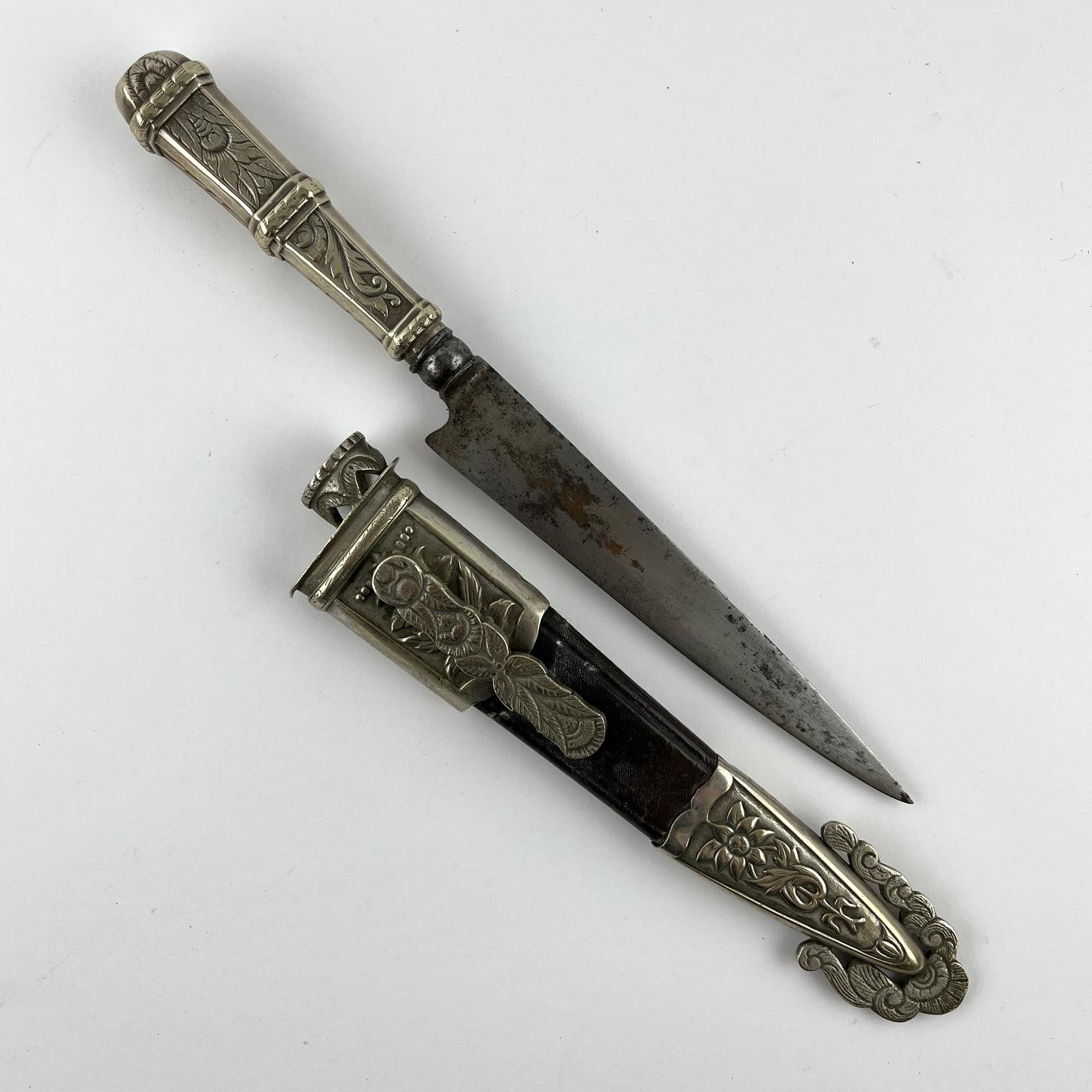 Cuchillo criollo. Hoja «El Criollo». Cabo, bocavaina y puntera en metal decorado «hojas y flores». Vaina picasa en cuero marrón. Largo total 27 cm.
