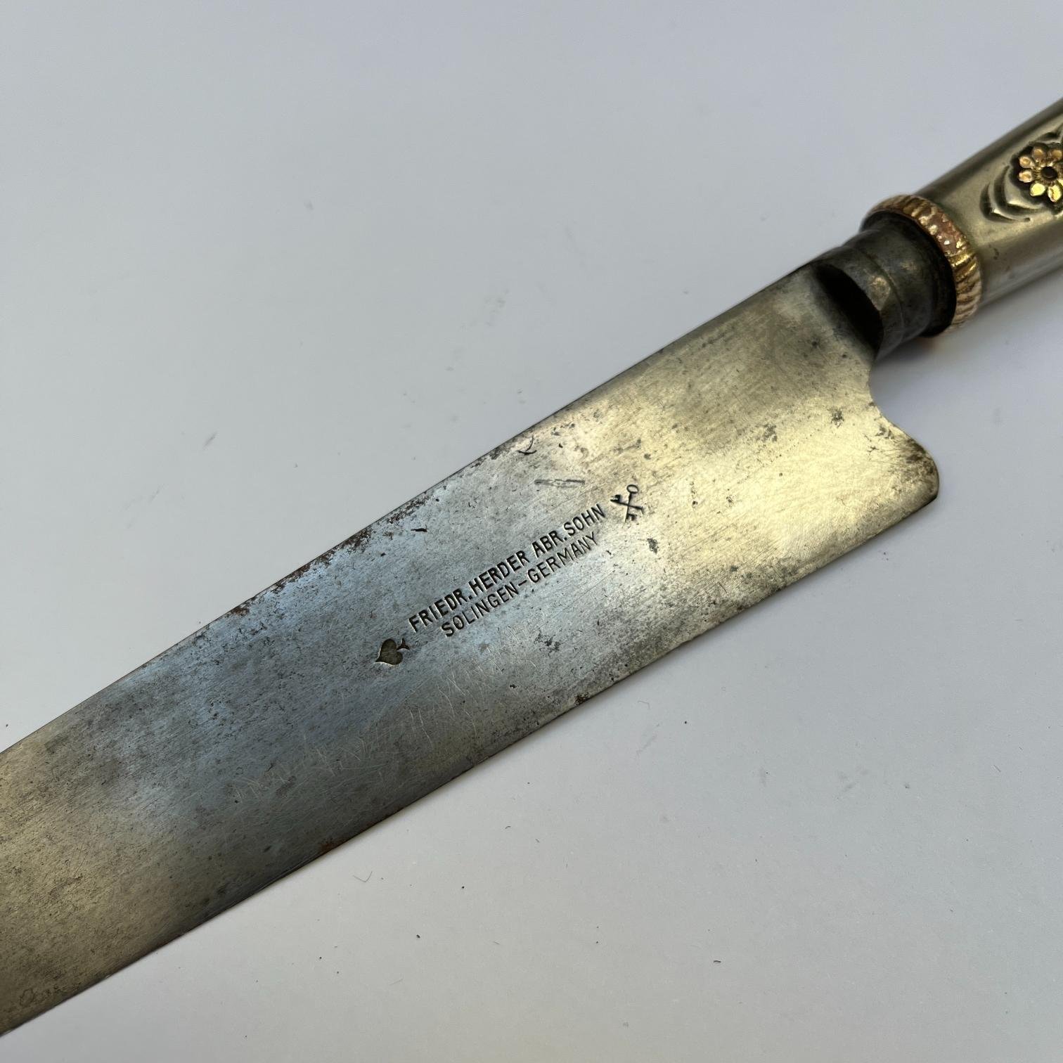 Cuchillo criollo. Hoja «Pic-Dos llaves» de Herder, Solingen. Cabo en plata y oro cincelado «hojas y flores». Largo total 32 cm.
