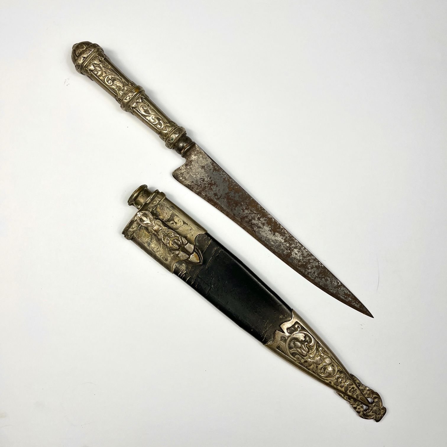 Cuchillo criollo. Cabo cuadrado, bocavaina y puntera en plata cincelada «hojas y flores». Vaina picasa en cuero marrón. Largo total 40 cm.