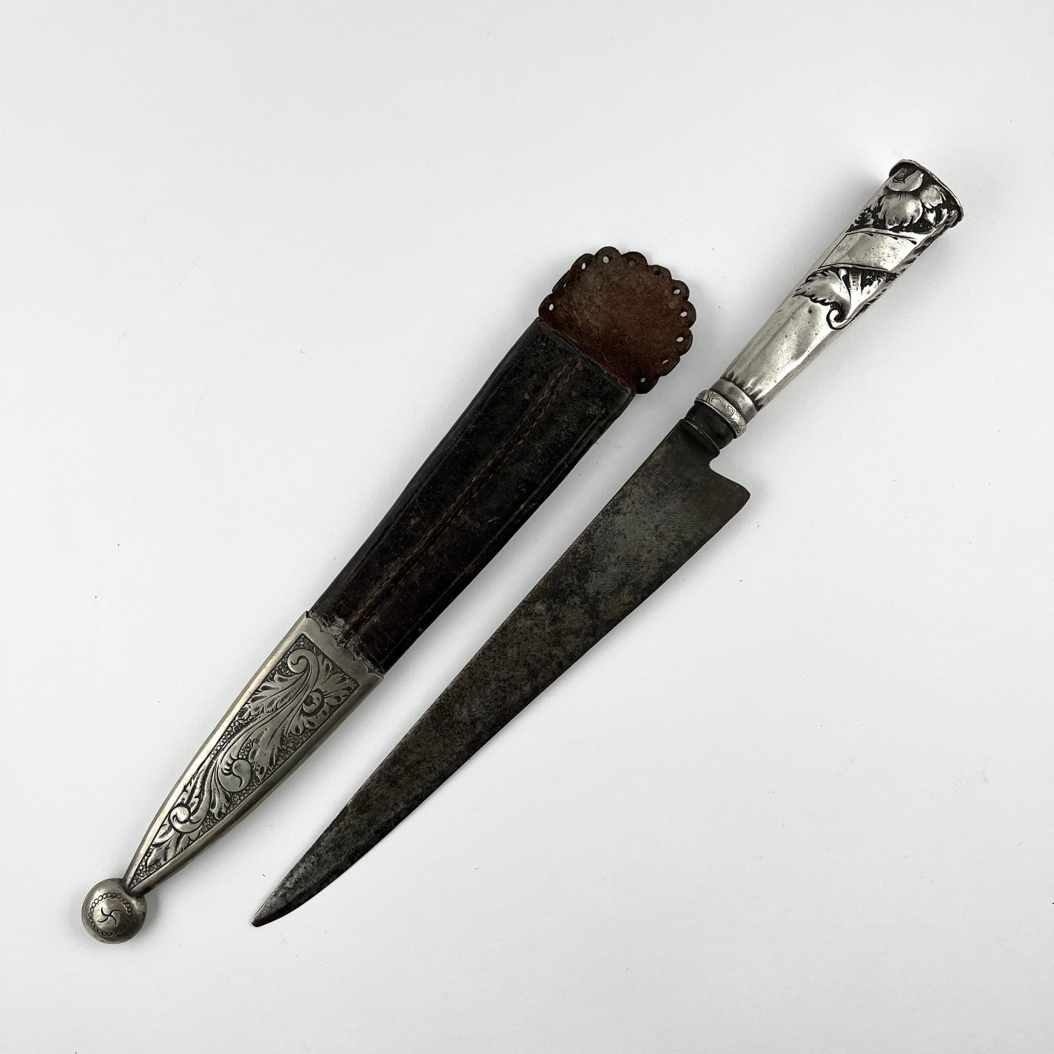 Cuchillo criollo. Hoja con marca ilegible, al dorso sellada D coronada. Cabo y puntera en plata cincelada «hojas y flores». Largo 40 cm. Vaina en cuero marrón.