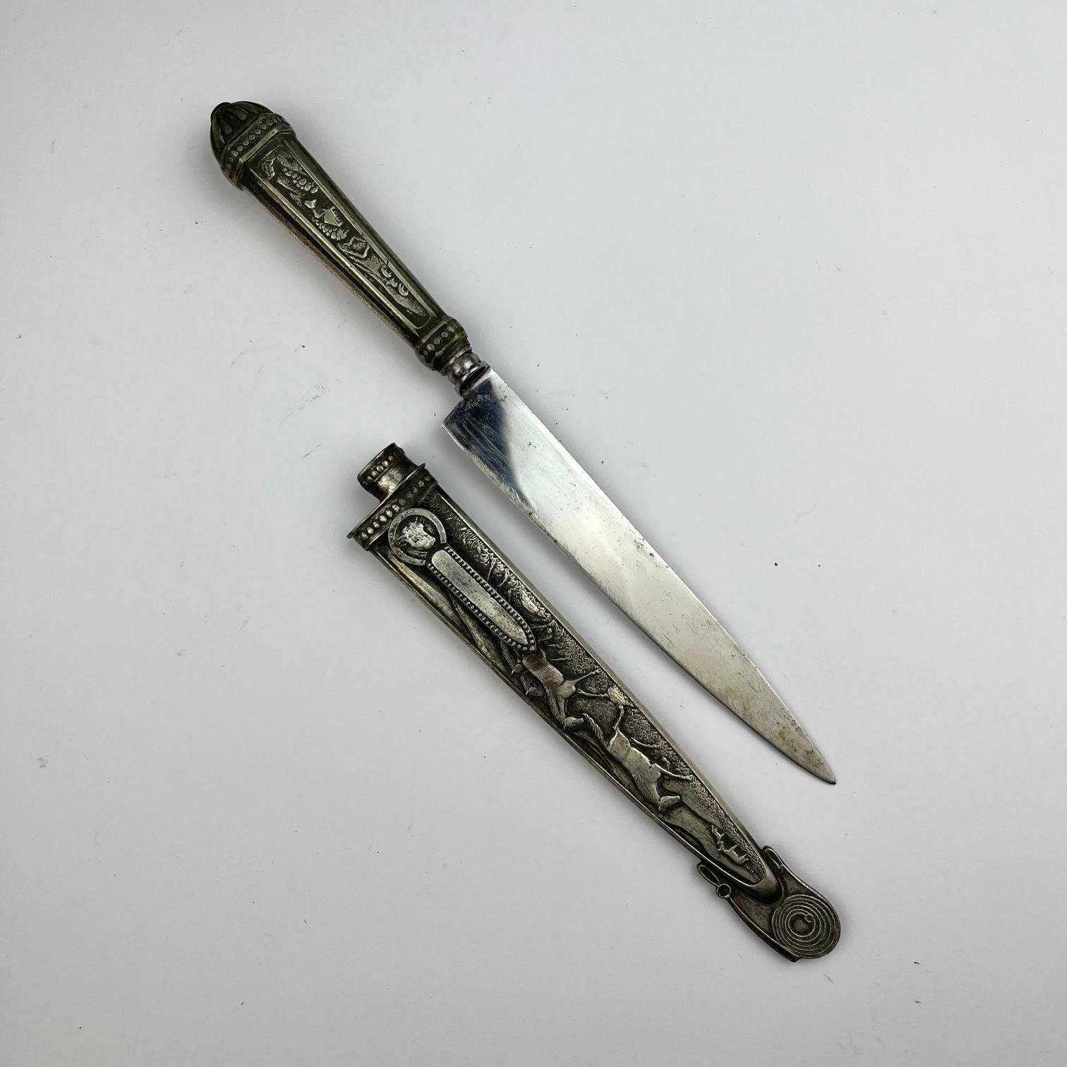 Cuchillo criollo riograndense. Hoja «Elmo» en acero inoxidable. Cabo y vaina en metal estampado «escenas gauchescas». Largo total 29 cm.