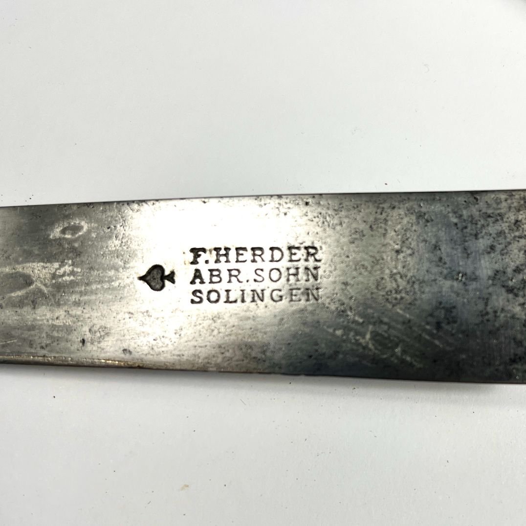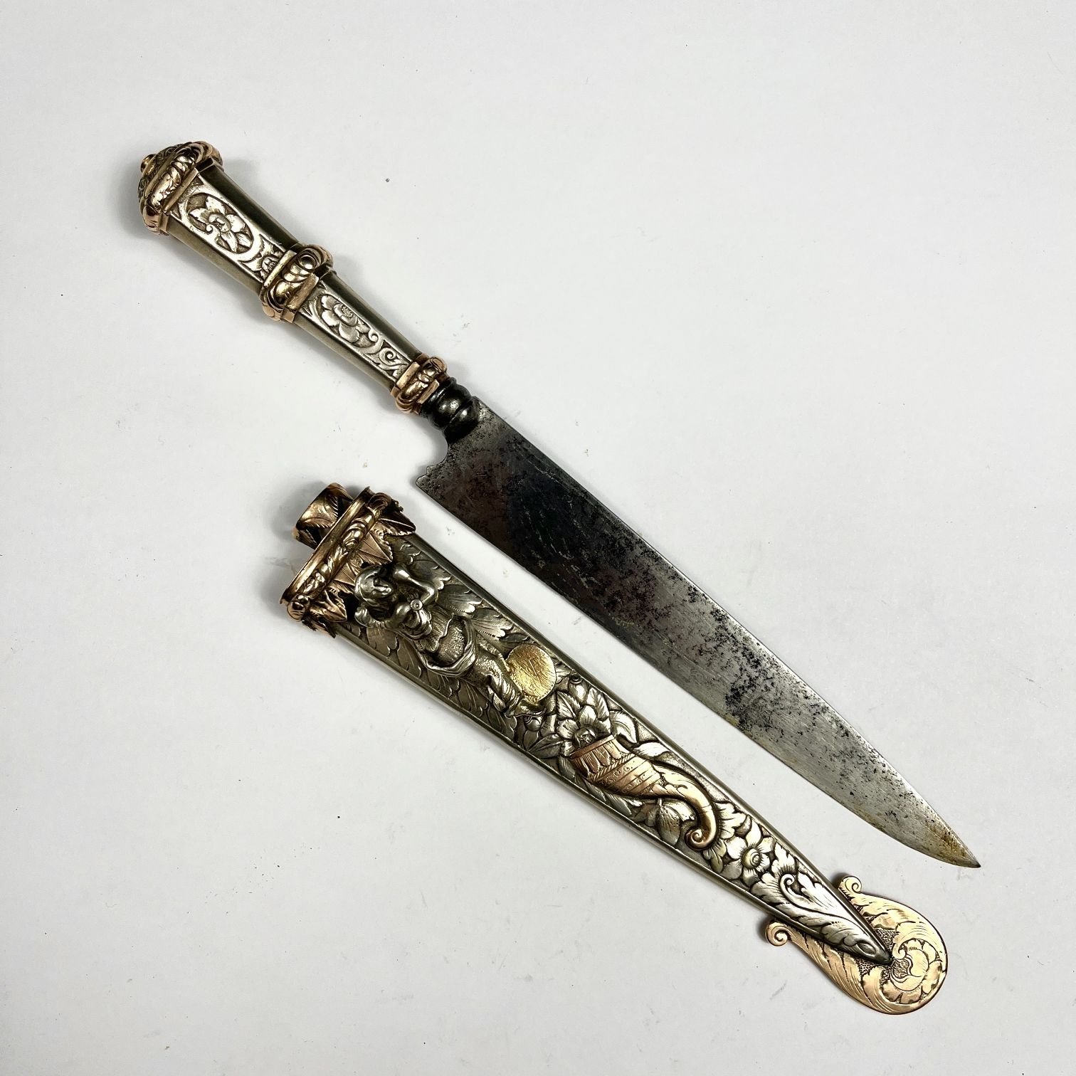 Cuchillo criollo riograndense. Hoja “Pic” de F. Herder, Solingen. Cabo y vaina en plata y oro cincelados «hojas, flores, ave y cuerno de la abundancia». Gancho esculturado «dama». Largo total 28.5 cm. Realizado por el platero Diogo Pirez da Fonseca.
