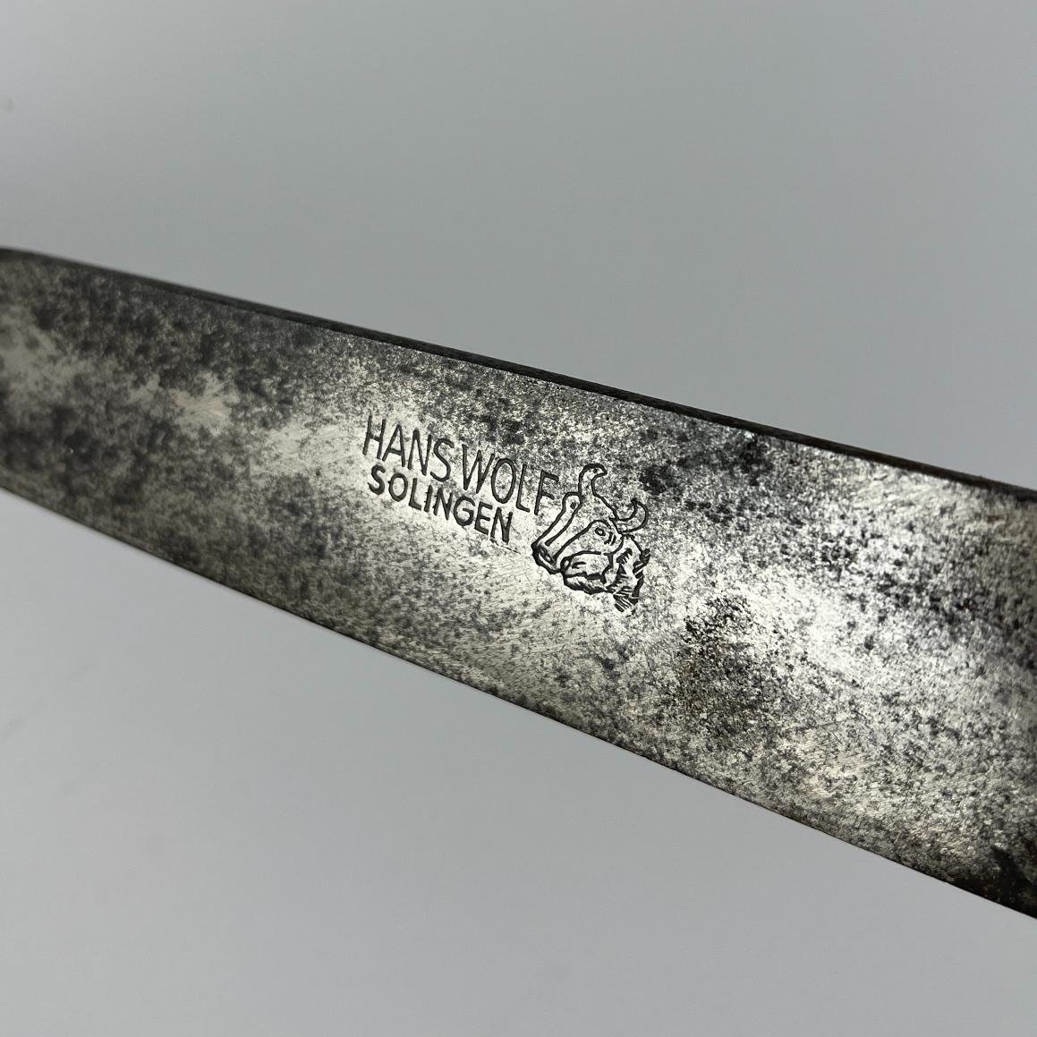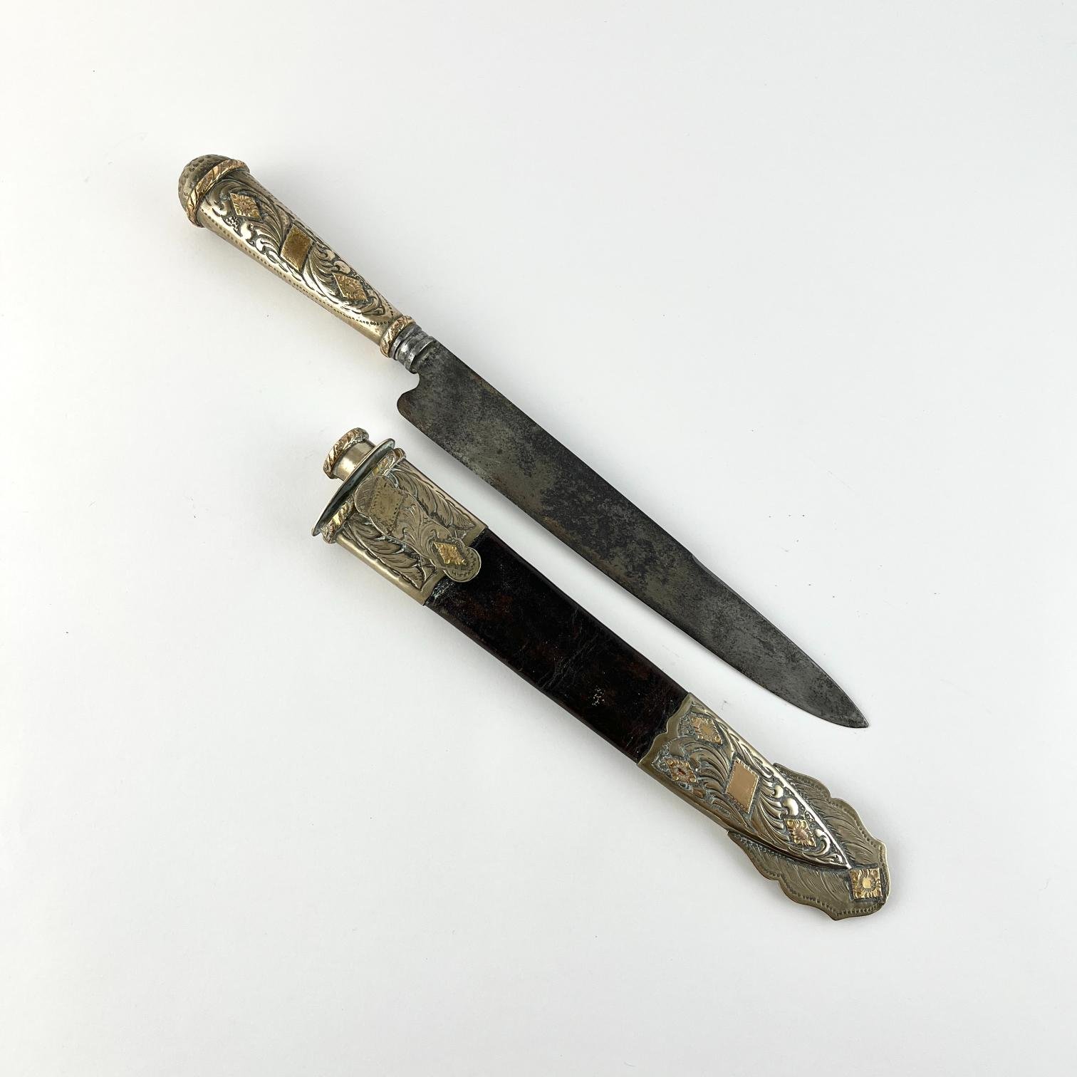 Cuchillo criollo uruguayo. Hoja «Hans Wolf», Solingen. Cabo, bocavaina y puntera en plata y oro cincelados «hojas y flores». Largo total 37 cm.