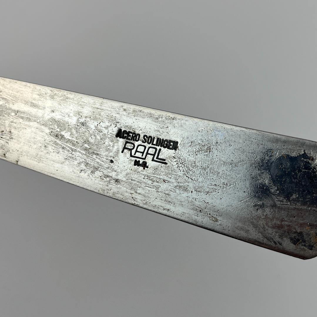 Cuchillo criollo uruguayo. Hoja «Raal». Cabo en plata y oro cincelado «hojas y flores», con iniciales «J.S.». Largo total 36 cm. Vaina en cuero marrón.