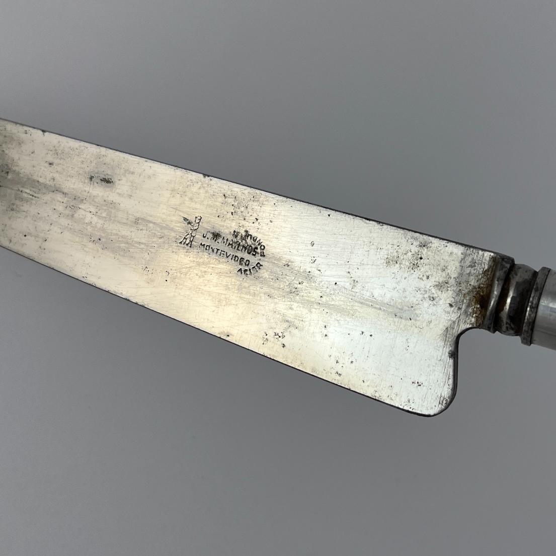 Cuchillo criollo uruguayo. Hoja «Cazador a la Punta» de J.M. Mailhos, Montevideo, acier fondu. Cabo en baquelita facetada. Largo total 35 cm. Vaina en cuero marrón.