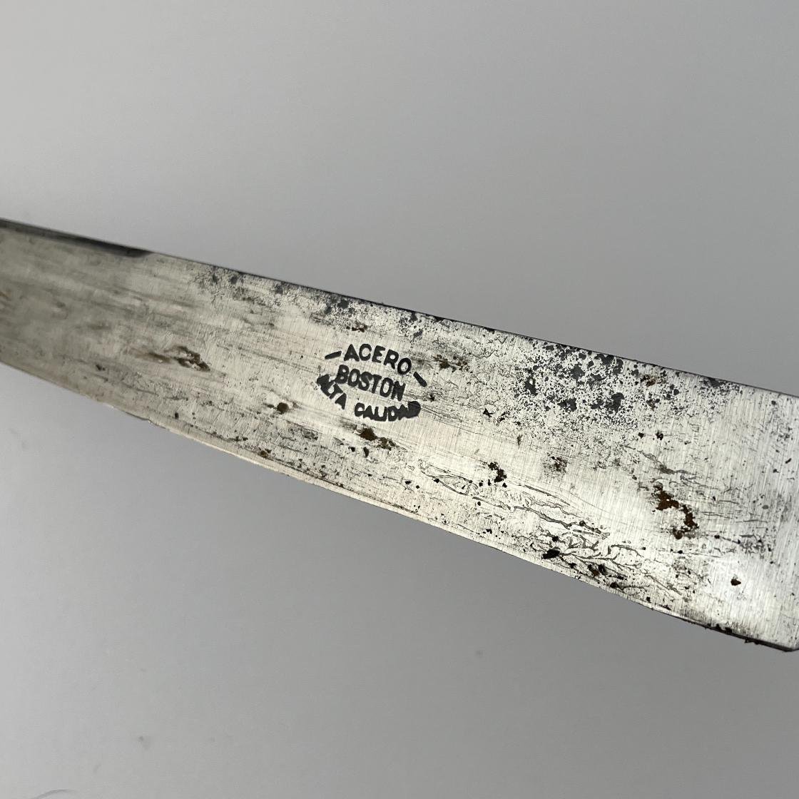Cuchillo criollo uruguayo. Hoja «Boston». Cabo en plata y oro cincelado «hojas y flores», con iniciales «J.P.» grabadas. Largo total 32 cm. Vaina en cuero marrón.