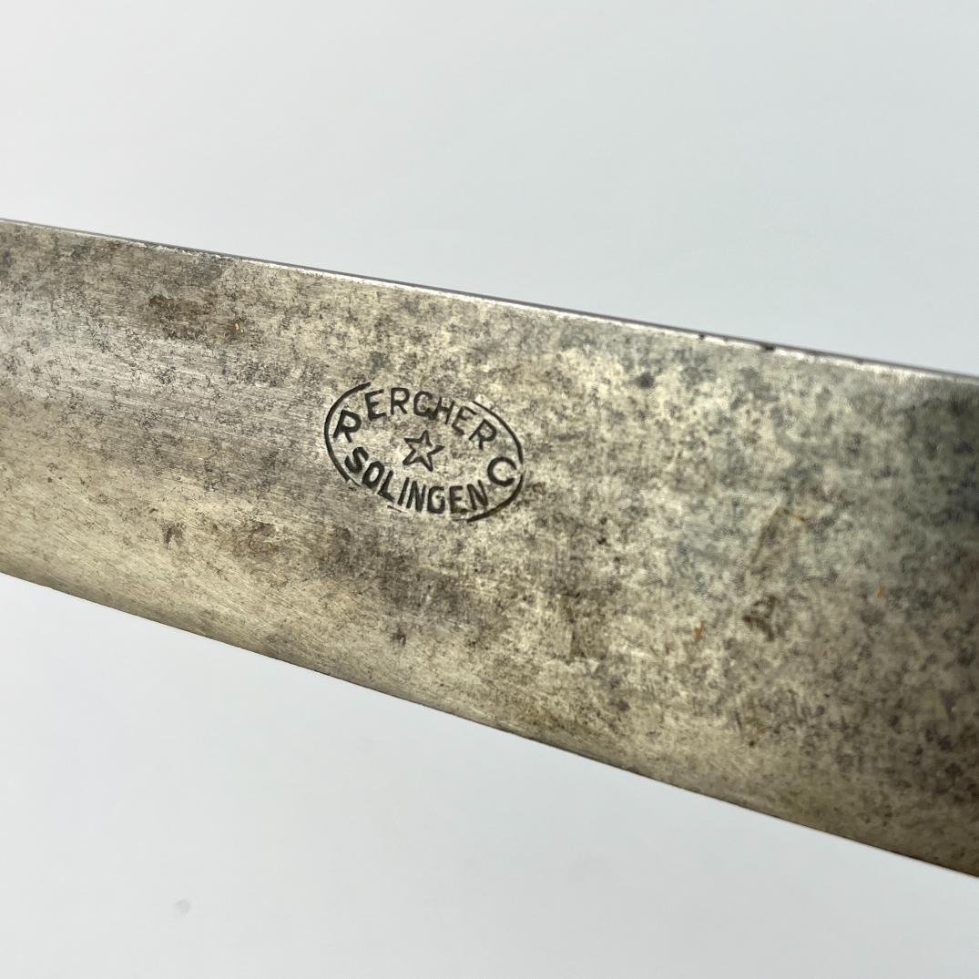 Cuchillo criollo uruguayo. Hoja «Ercher», Solingen. Cabo en baquelita negra facetada. Virola en metal. Largo total 36, 5 cm. Vaina en cuero marrón.