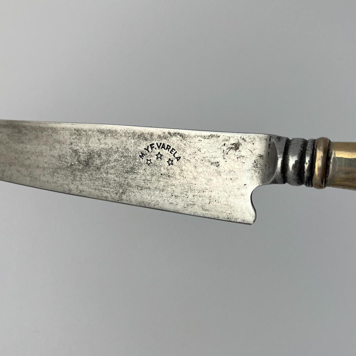 Cuchillo criollo uruguayo. Hoja «M.Y F. Varela». Cabo en plata y oro cincelado «hojas y flores». Largo total 29 cm. Vaina en cuero negro.