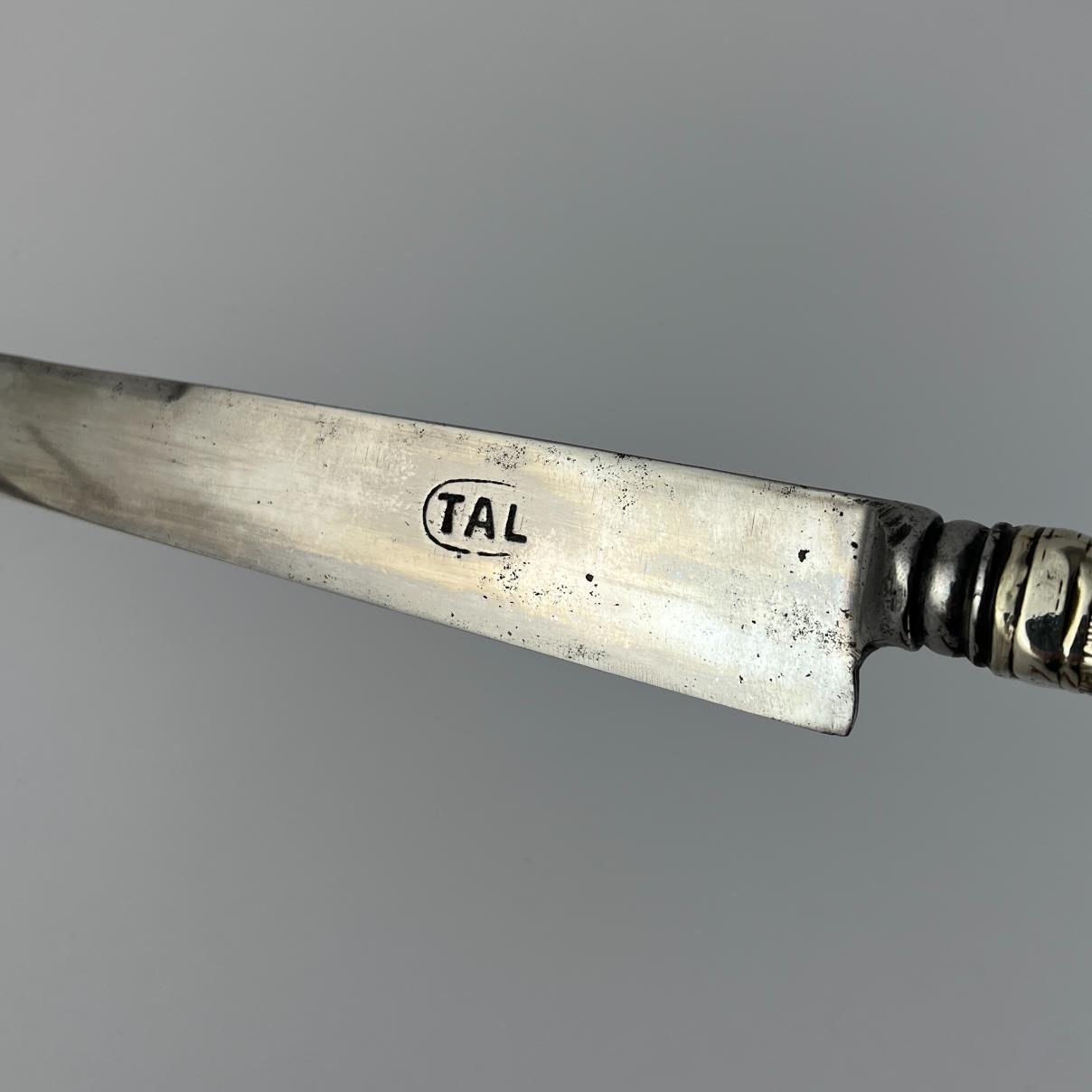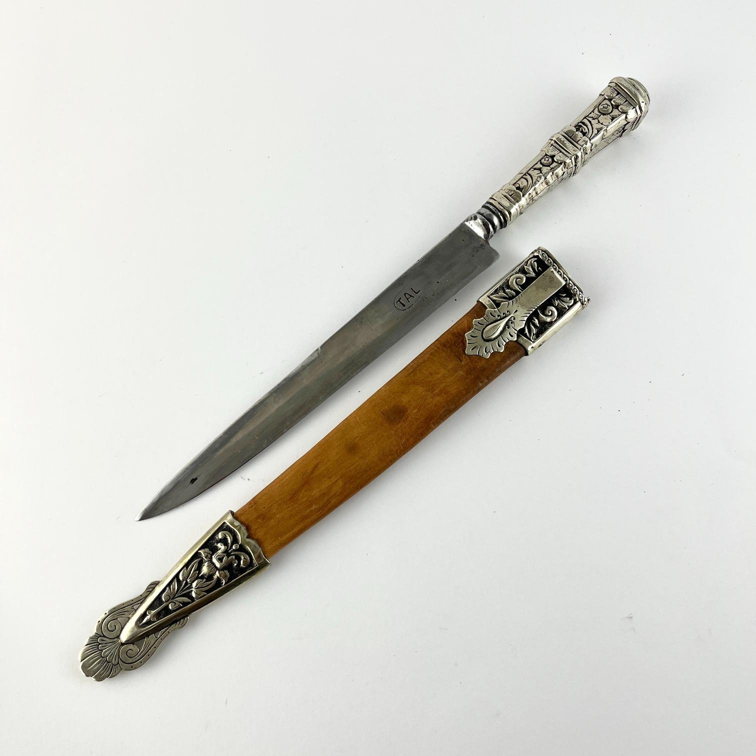 Cuchillo criollo uruguayo. Hoja «Tal». Cabo, bocavaina y puntera en metal blanco estampado «flores». Vaina picasa en cuero marrón. Largo total 44 cm.