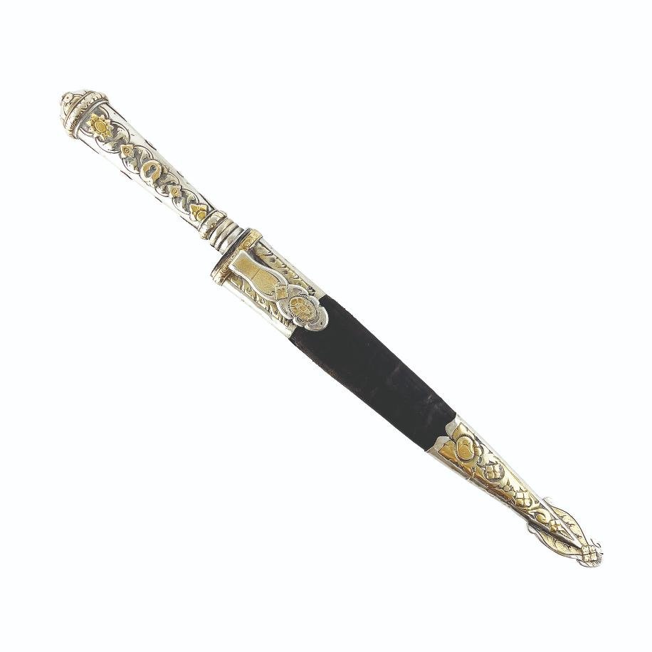 Cuchillo criollo uruguayo. Hoja «Dos Macacos» de Henkels, Solingen. Cabo en plata y oro cincelado «hojas y flores», con iniciales «M.O.» en oro. Vaina picasa en cuero negro, con bocavaina y puntera en plata y oro cincelados «hojas y flores». Cabo y vaina hermanados. Largo total 40 cm.