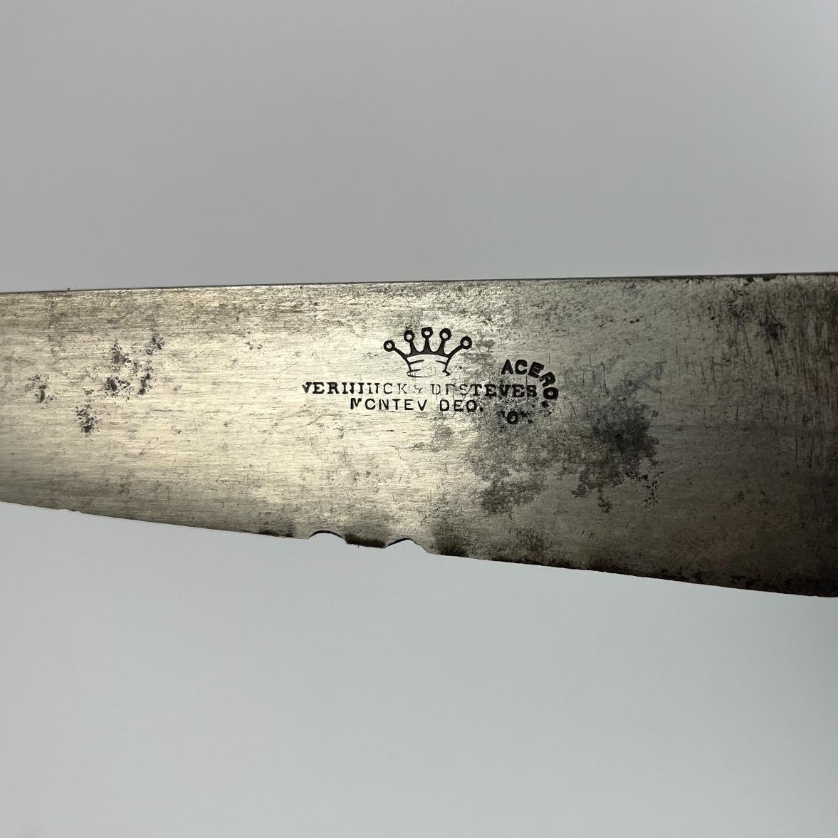 Cuchillo criollo uruguayo. Hoja «Vernink y Desteves», Montevideo. Cabo y vaina en plata y oro cincelados «hojas, flores, frutos y ciervo». Largo total 36 cm.