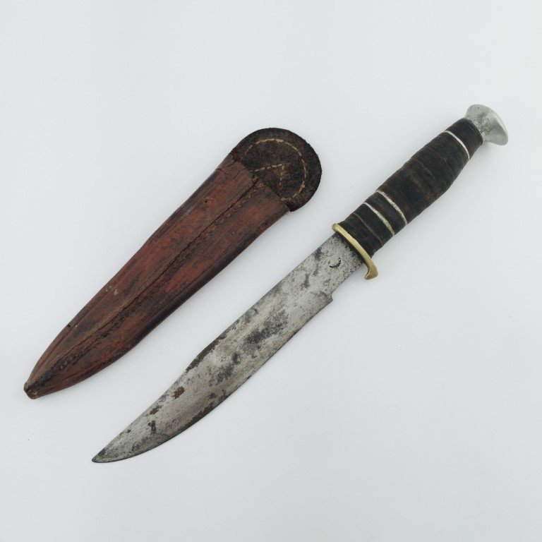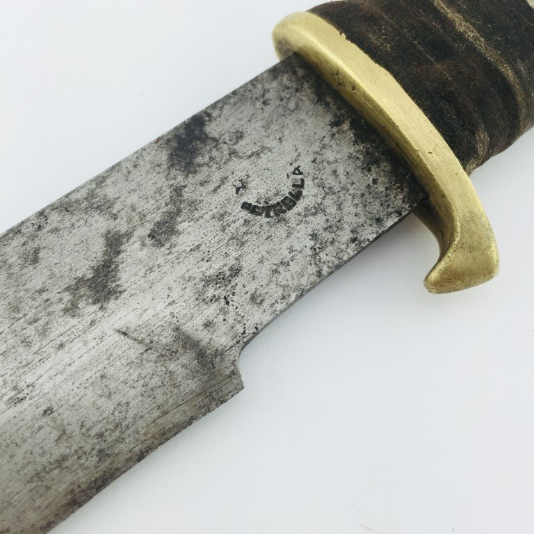 Cuchillo de caza marca Lobo. Hoja con desangrador. Cabo en aros de cuero. Pomo en aluminio y gavilán en bronce. Largo total 34 cm.