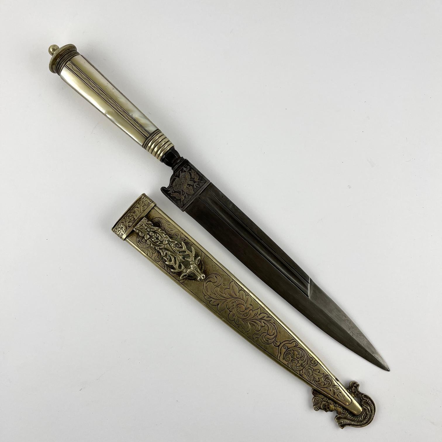Cuchillo europeo s. XIX. Hoja con sección tipo daga y desangrador, con base grabada al ácido «arabescos y motivos militares», con restos de dorado. Botón facetado. Empuñadura en alpaca, con cachas en madreperla. Vaina en alpaca decorada «arabescos». Gancho esculturado «ciervo». Largo total 36 cm.
