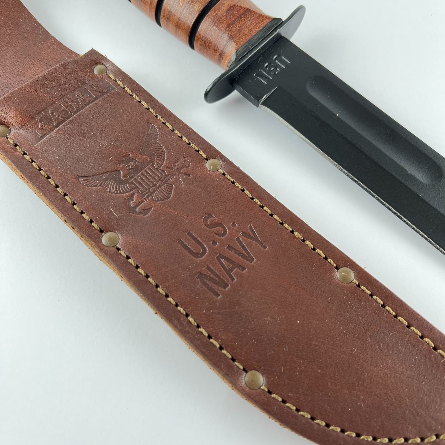 Cuchillo KABAR de la Marina estadounidense. Cabo en aros de cuero. Vaina original en cuero estampado. Largo total 36 cm.