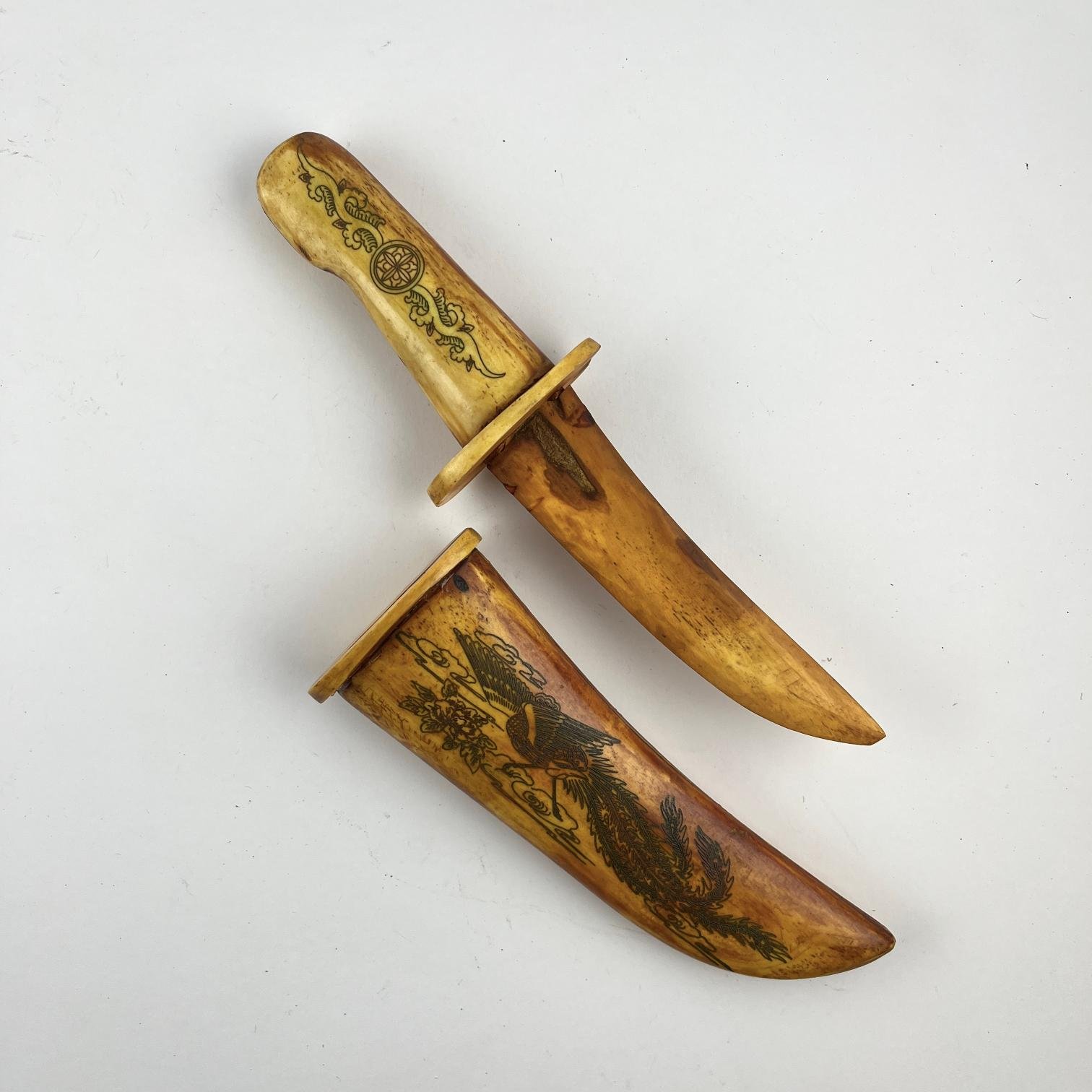 Cuchillo oriental. Hoja, cabo y vaina en hueso tallado «dragones y pavo real». Firmado. Largo total 26 cm.