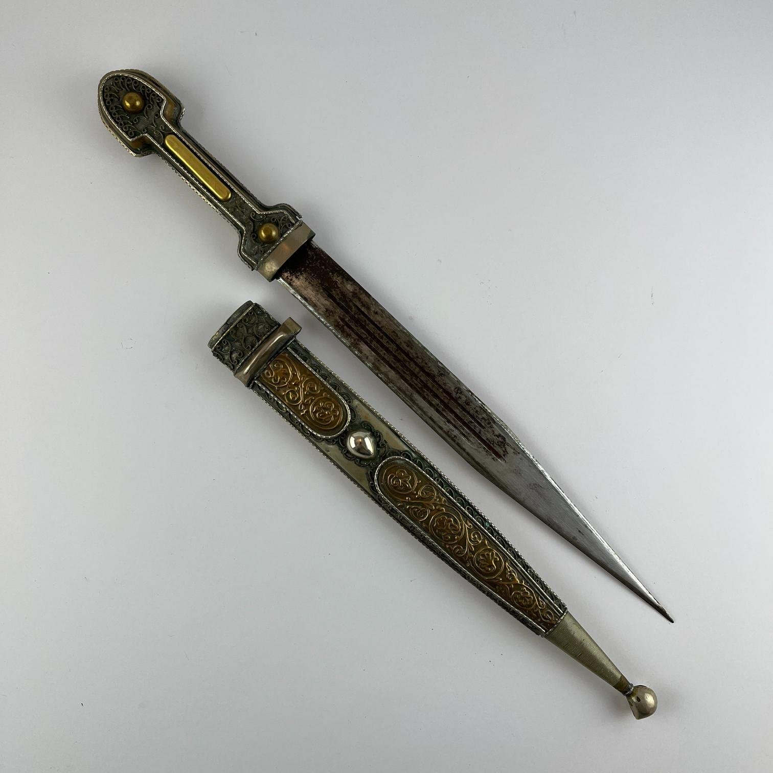 Cuchillo ruso tipo kindjal. Hoja con desangradores. Cabo y vaina en metal blanco y bronce decorado «arabescos». Largo total 45 cm.