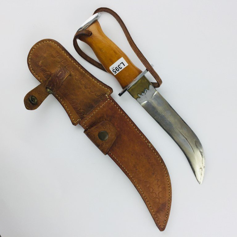 Cuchillo táctico chileno tipo corbo, con empuñadura en madera y vaina en suela. Fabricado por Famae. Afilado.
