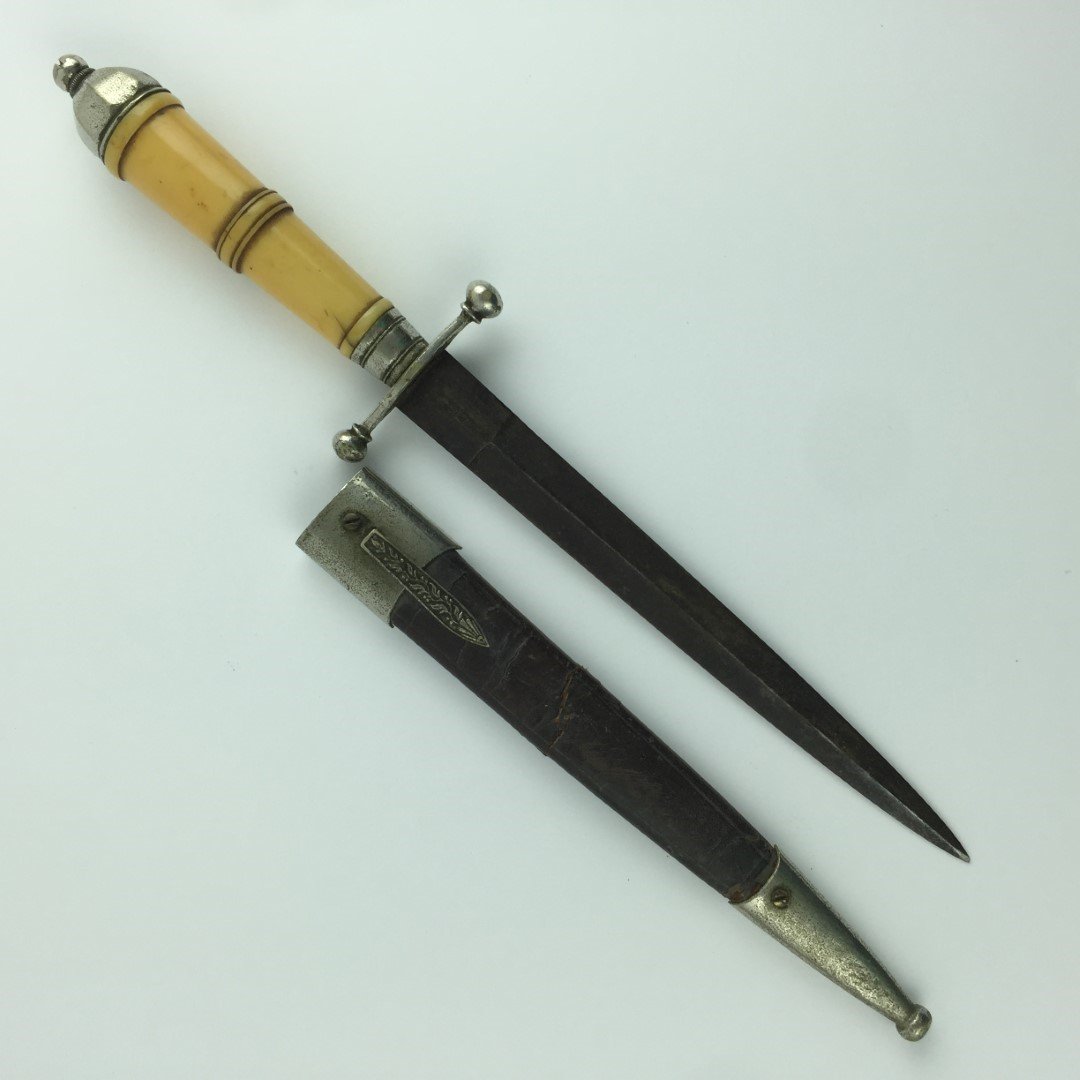Daga alemana fabricada por Kirschbaum. Hoja de cuatro caras. Empuñadura en marfil de morsa con pomo, virola, gavilán, bocavaina y puntera en metal plateado. Vaina picasa en cuero marrón, con pequeñas averías. Largo 30.5 cm.