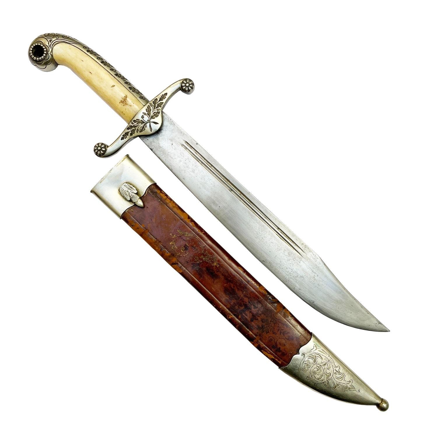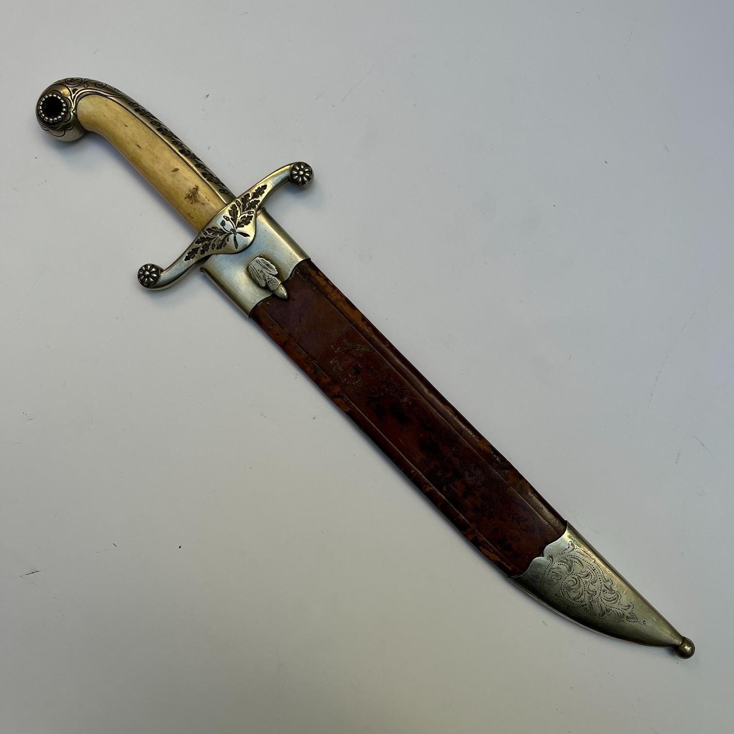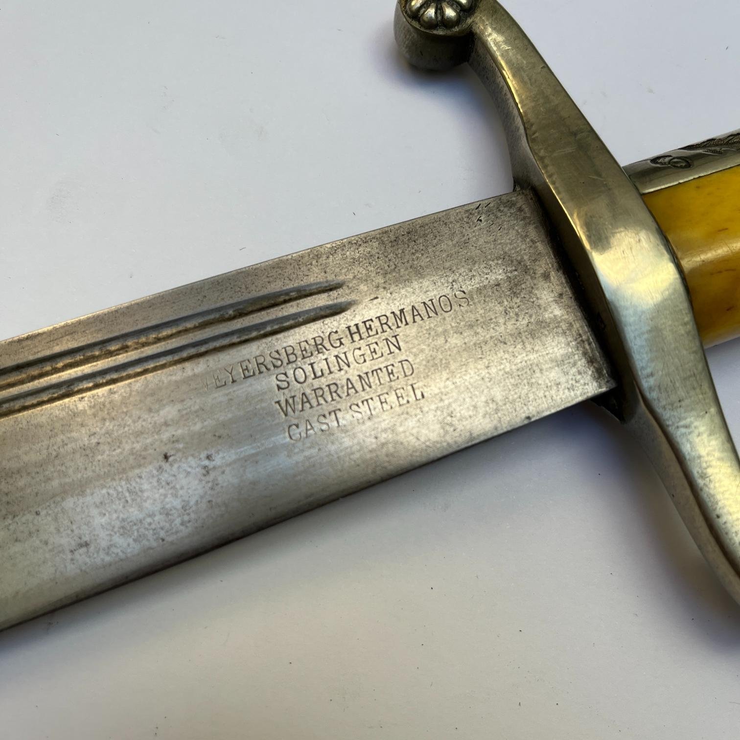 Daga alemana de cacería, fabricada por Weyersberg Hermanos, Solingen. Hoja con desangradores. Cabo en hueso y alpaca cincelada «hojas de roble y bellotas». Gavilán cincelado «hojas». Bocavaina y puntera en alpaca cincelada «arabescos». Gancho esculturado «bellota». Vaina en cuero marrón decorado «hojas», con restos de dorado. Largo total 46 cm.