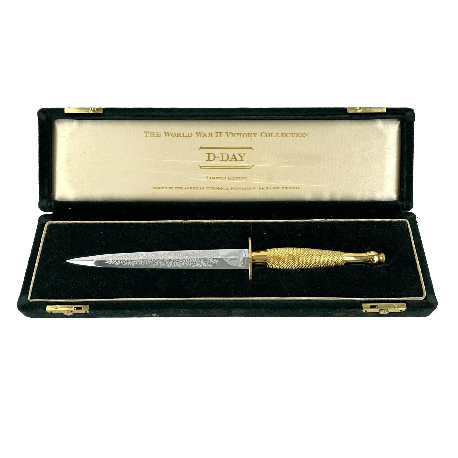 Daga de comando Fairnbairn-Sykes, conmemorativa del Día D, desembarco en Normandía, fabricada por Wilkinson Sword Co. Ltd., Londres. Empuñadura dorada y segrinada. Hoja grabada al ácido » In honor of the D- Day invasion, sixth of june, 1944″ y «Accept nothing less than full Victory». Largo 30 cm. Presentada en caja de madera forrada en terciopelo verde con herrajes dorados.